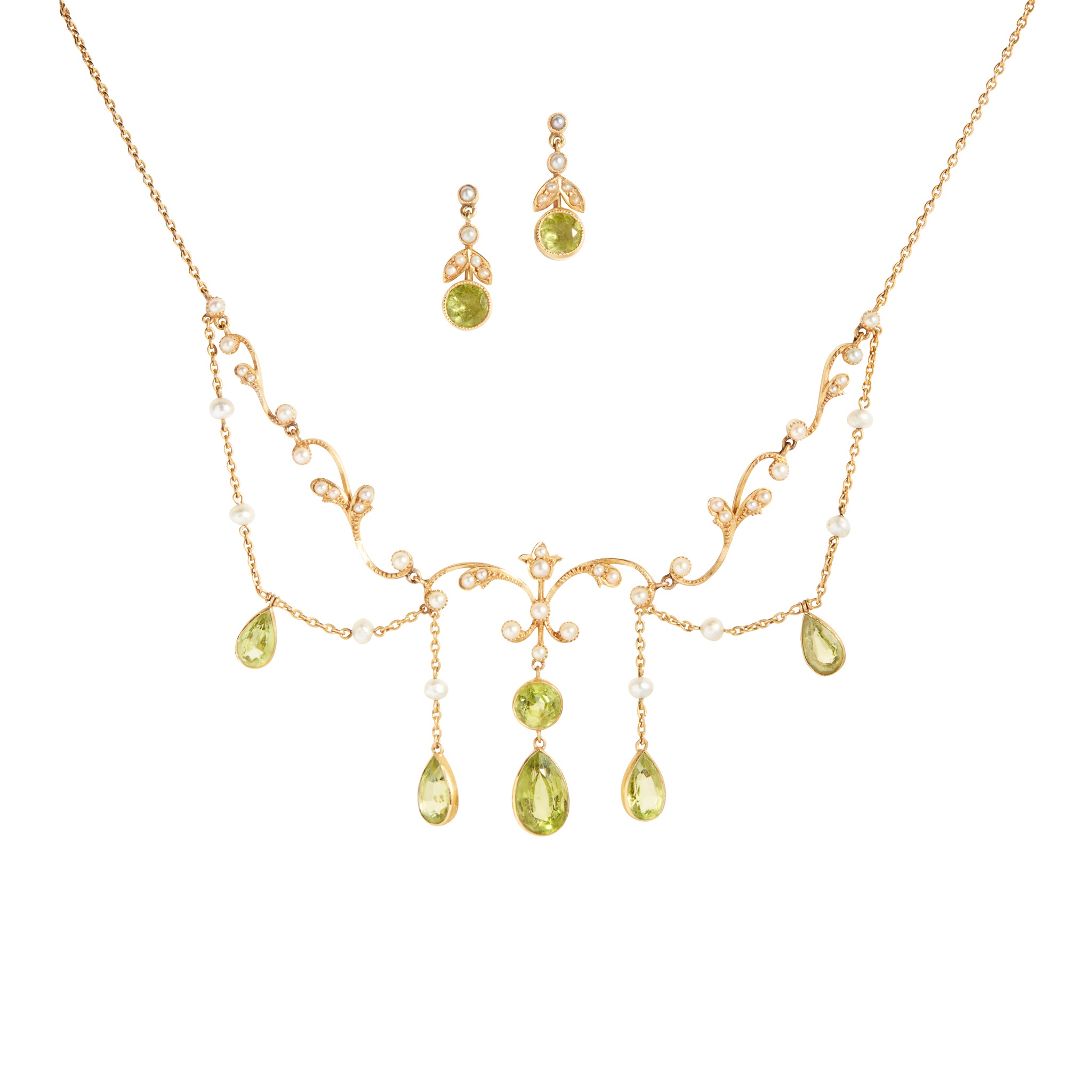Of scrolling swag design, set at intervals with seed pearls and oval and pear-shaped peridots, stamped 15; the earrings of matching design, unmarked