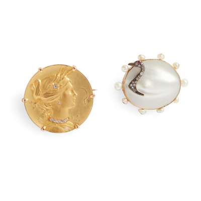 Depicting the goddess Ceres in profile, set with rose-cut diamond detail, monogram signature LR, French marks; together with a blister pearl brooch with applied rose-cut diamond detail, depicting a swan, unmarked