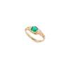 Claw-set with a cushion-cut emerald and two old round-cut diamonds, scrolling details to shoulders, indistinctly marked