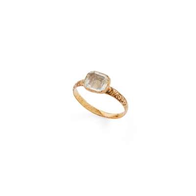 Set with an octagonal step-cut crystal, in a foil-backed setting with wirework detail below, the band with cast scrolling detail, engraved to inside of band 'JO obt 06th Feb ... at 73'