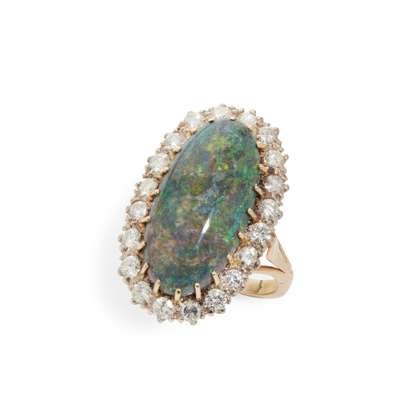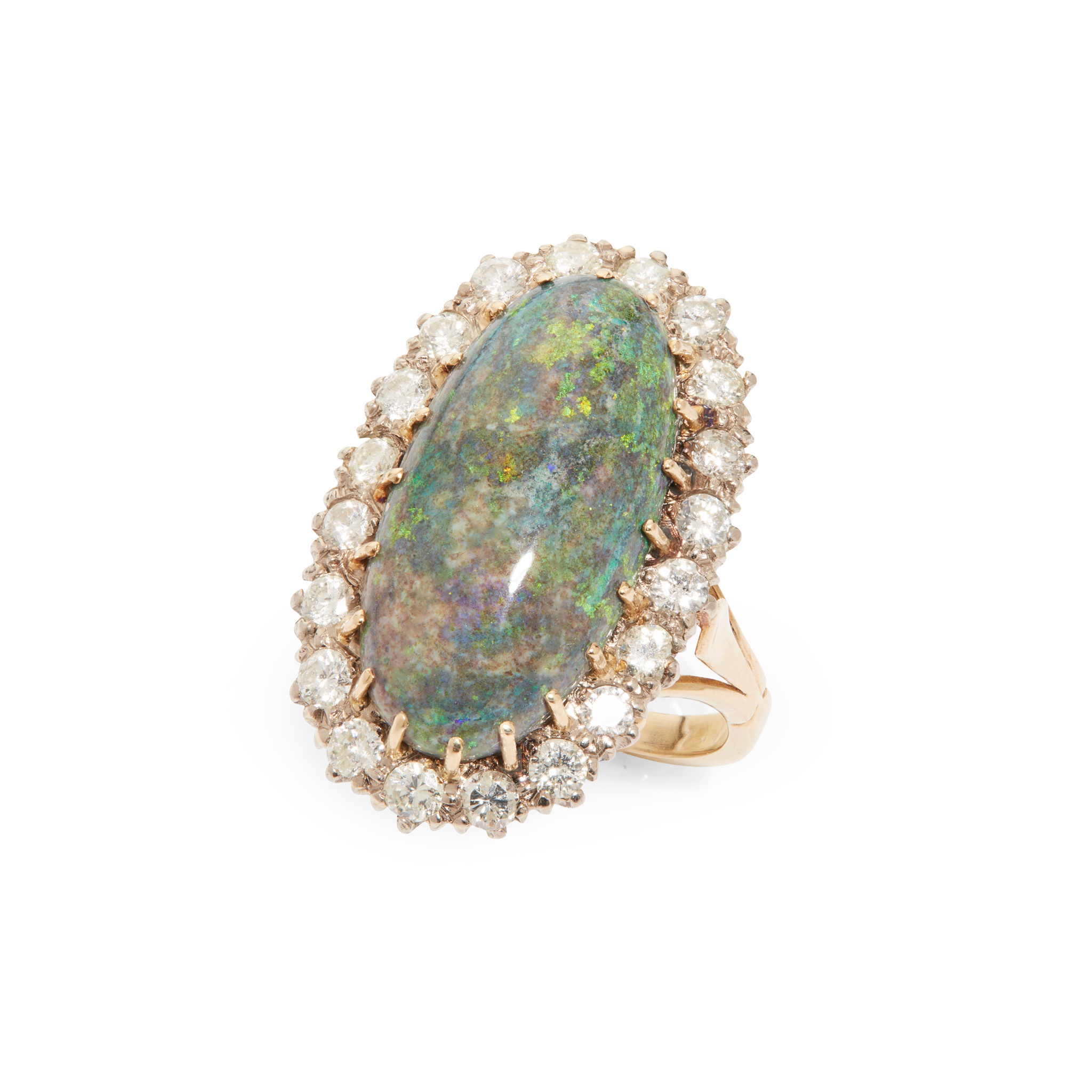 Claw-set with a cabochon boulder opal in a border of round brilliant-cut diamonds, unmarked
