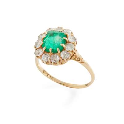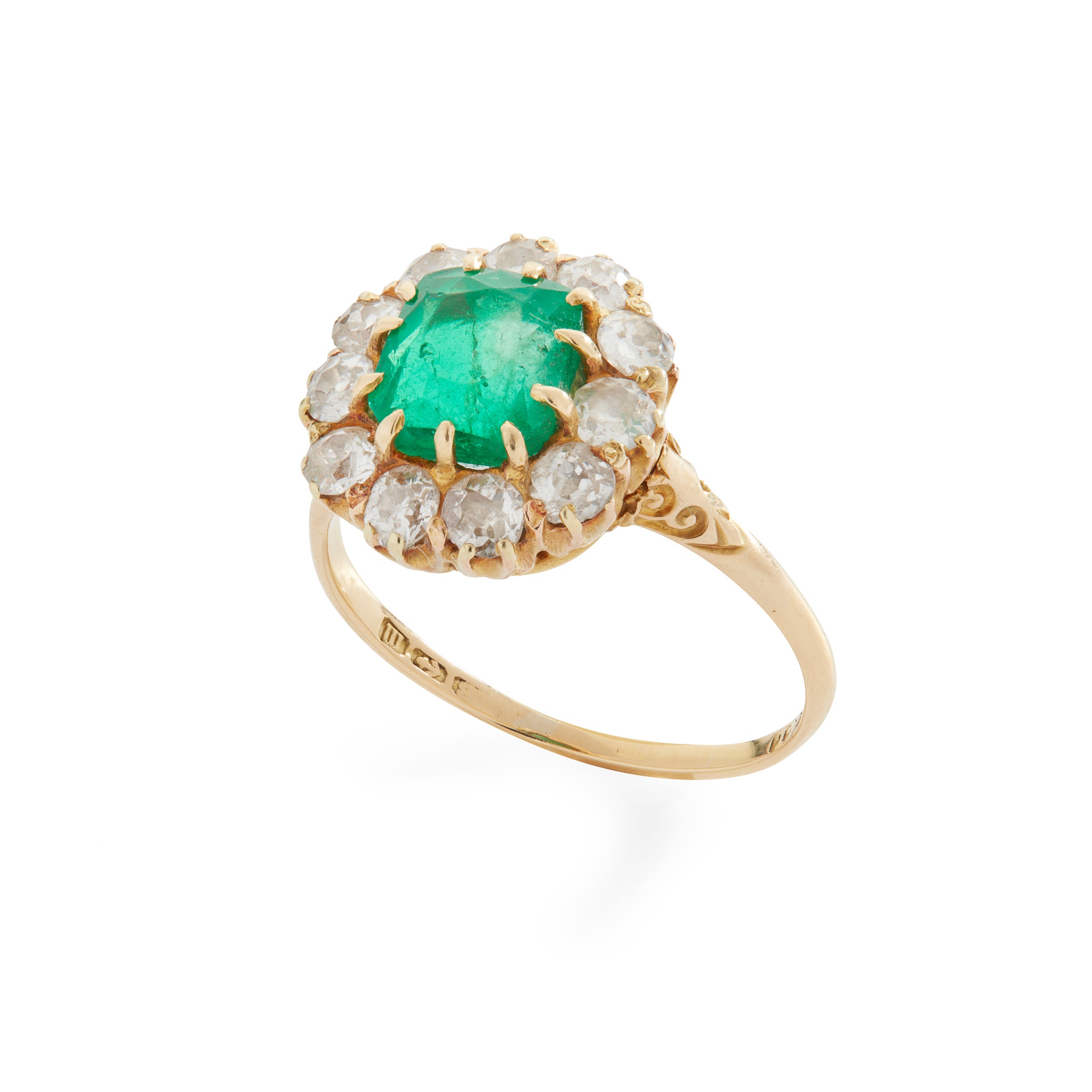Claw-set with a cushion-cut emerald in a border of old round-cut diamonds, indistinctly marked