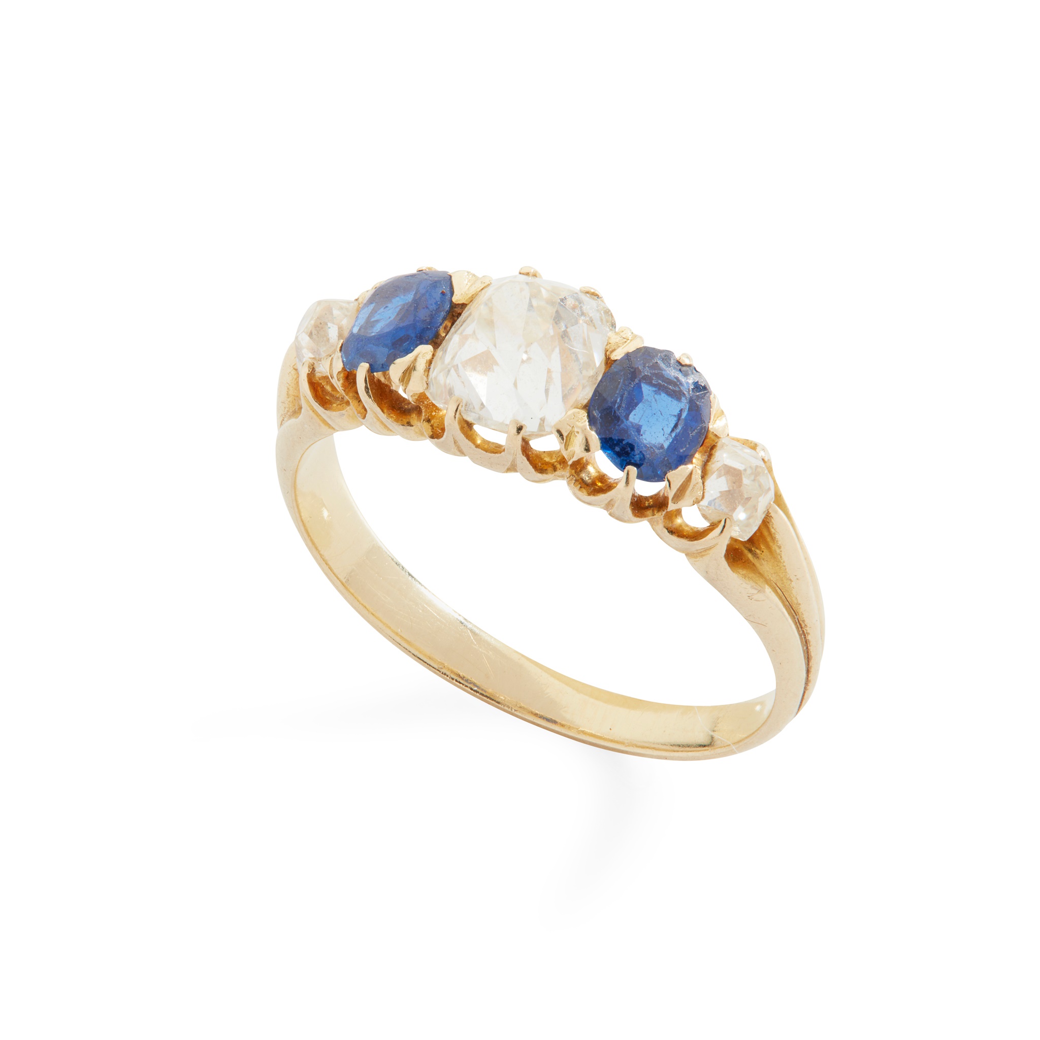 Claw-set with two oval-cut sapphires and three cushion-cut diamonds, unmarked