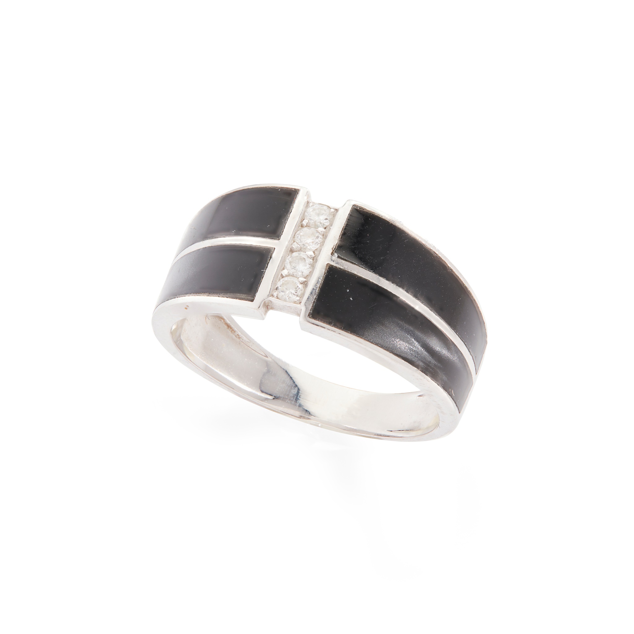 The iridescent black enamel detail with a central row of four round brilliant-cut diamonds, French marks to bands