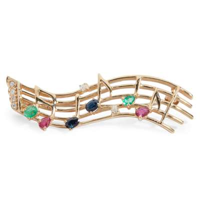 Modelled as musical notes, set with various rubies, emeralds, sapphires and diamonds, stamped 14k