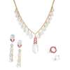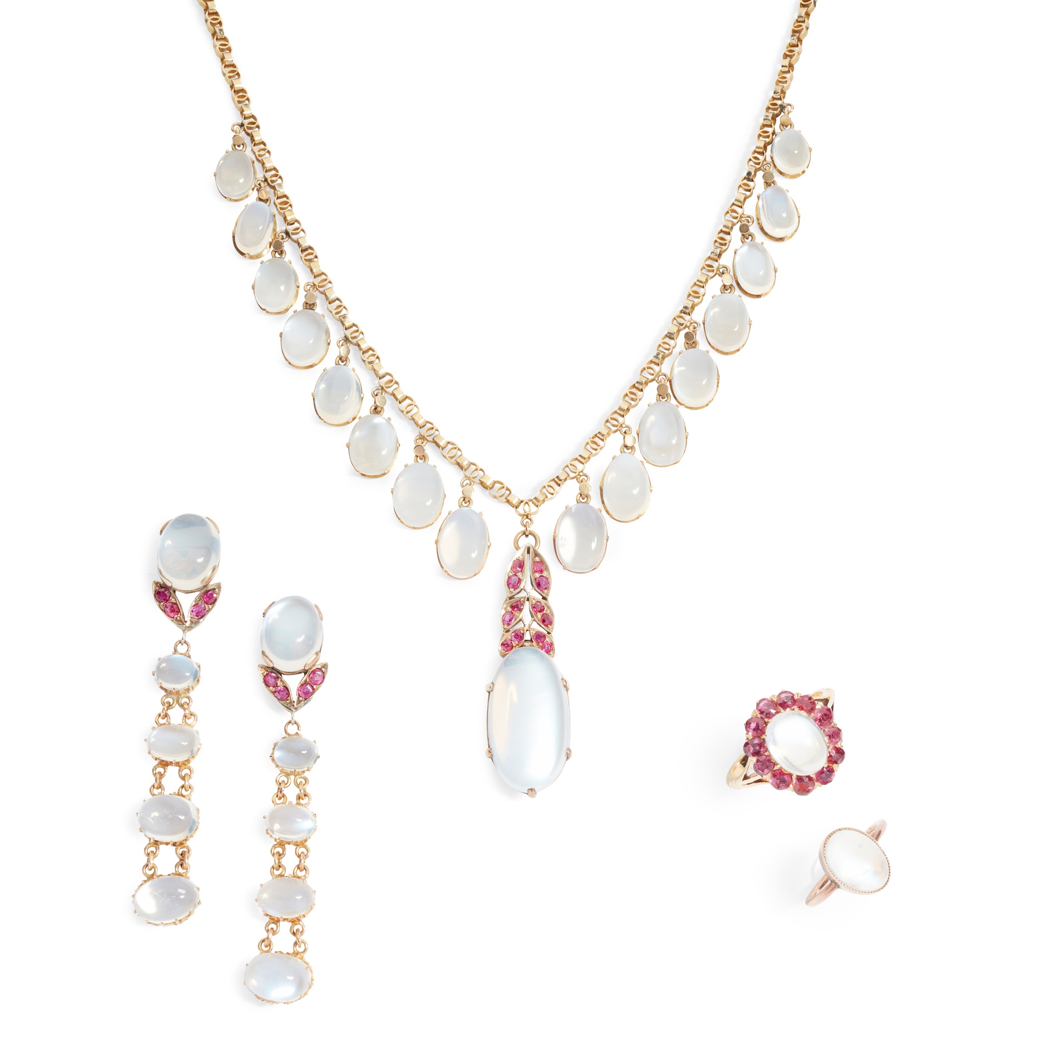Including a fringed necklace, earrings and two rings, set with graduated moonstone cabochons and round and cushion-cut rubies, unmarked