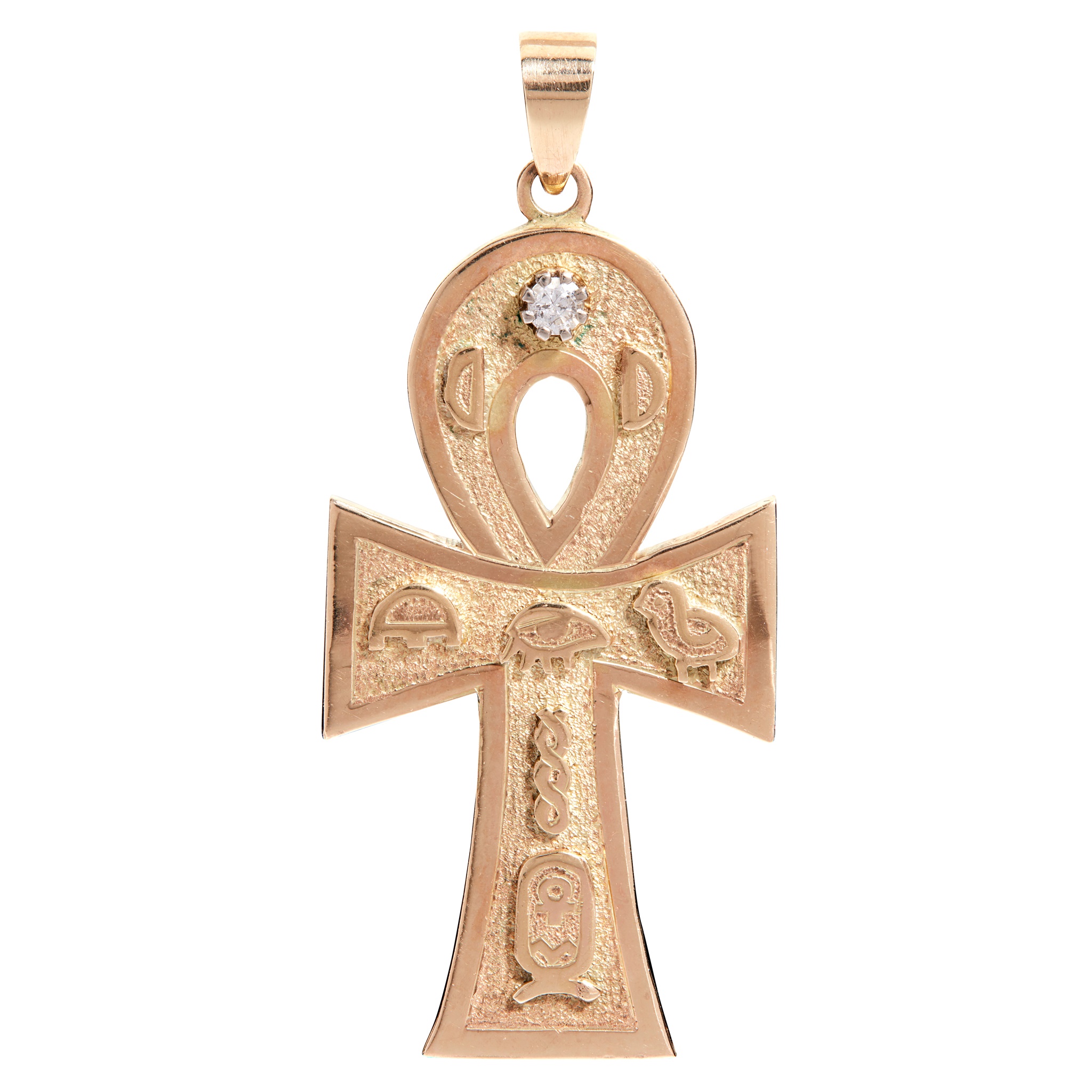 With hieroglyph detail, claw-set with a round brilliant-cut diamond, stamped 9ct