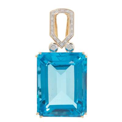 Claw-set with a cut-cornered rectangular step-cut blue topaz, suspended from an open-work round brilliant-cut diamond surmount, modelled in 18ct gold