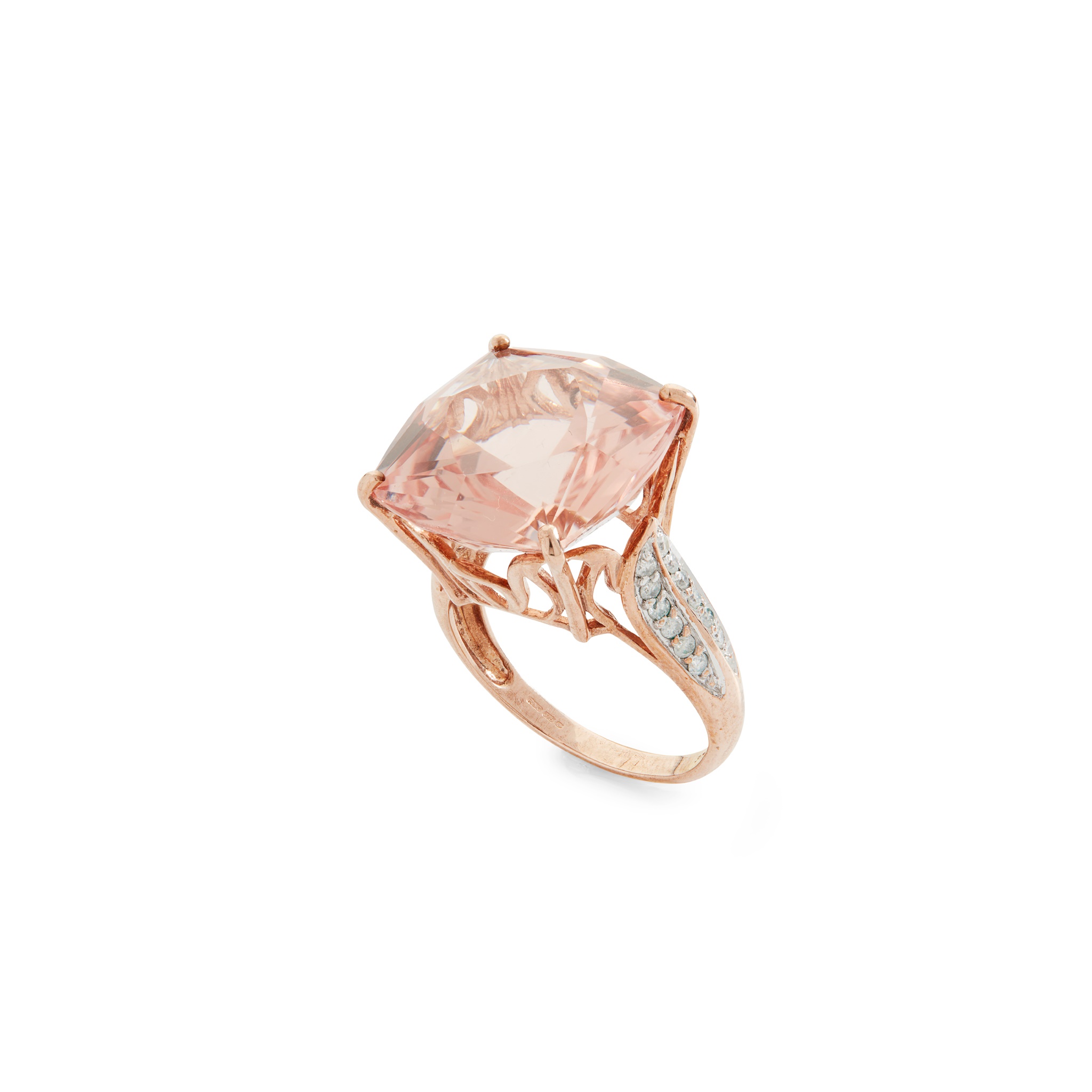 Claw-set with a fancy cushion-cut morganite, each shoulder pavé-set with round brilliant-cut diamonds, modelled in 9ct gold
