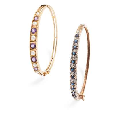 Both of hinged design, the first set with split pearls and round-cut amethysts, unmarked; the second set with round-cut sapphires and diamonds, modelled in 9ct gold