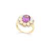 Claw-set with an oval mixed-cut amethyst, in a border of cabochon opals and round brilliant-cut diamonds, unmarked