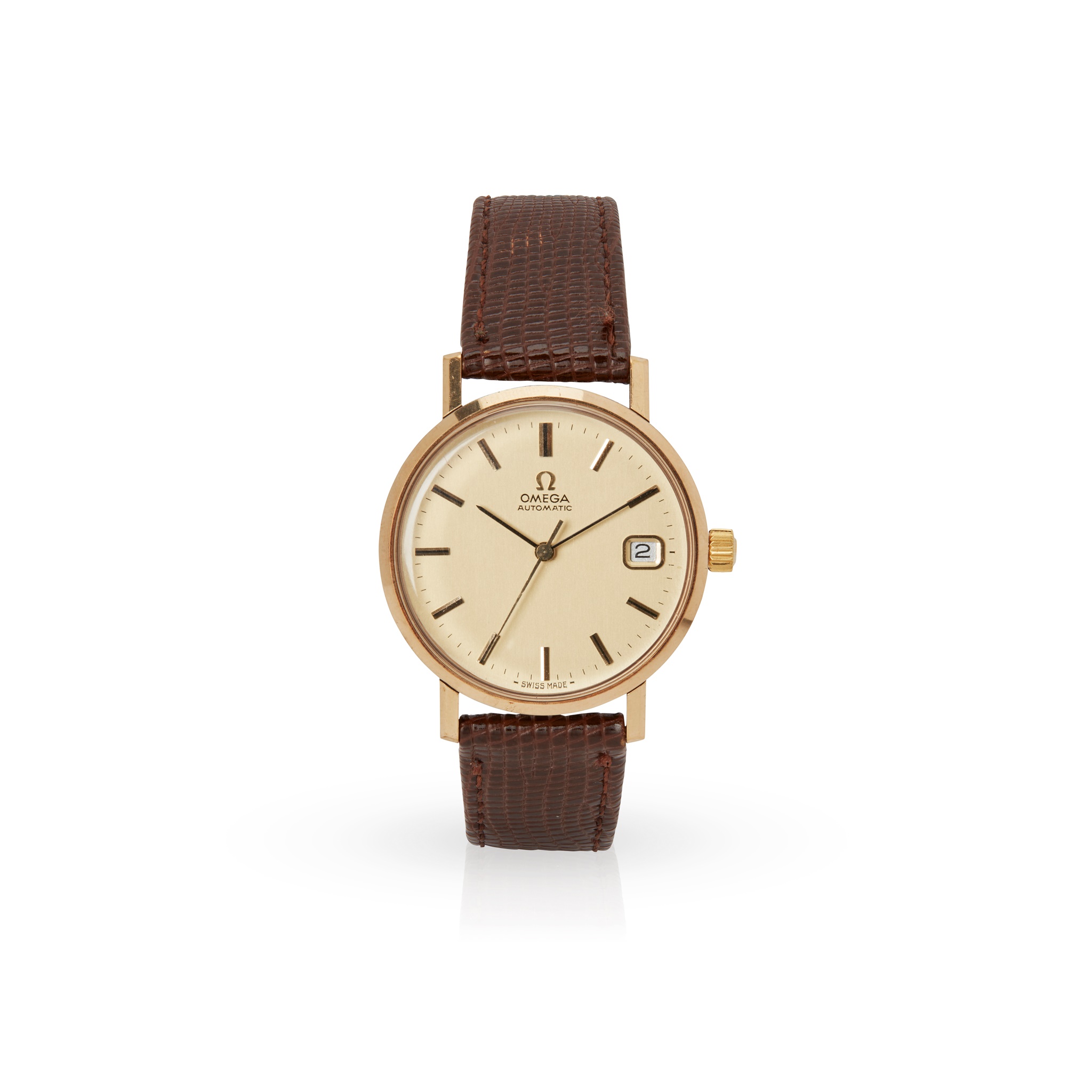 Circa 1977 from papers, automatic movement, round champagne dial with applied gold hour markers, date aperture at 3, out seconds track in black, gold pencil hands, crown with Omega logo, caseback with TOOL 106, on a generic brown lizard skin strap, in box, with outer box, with papers