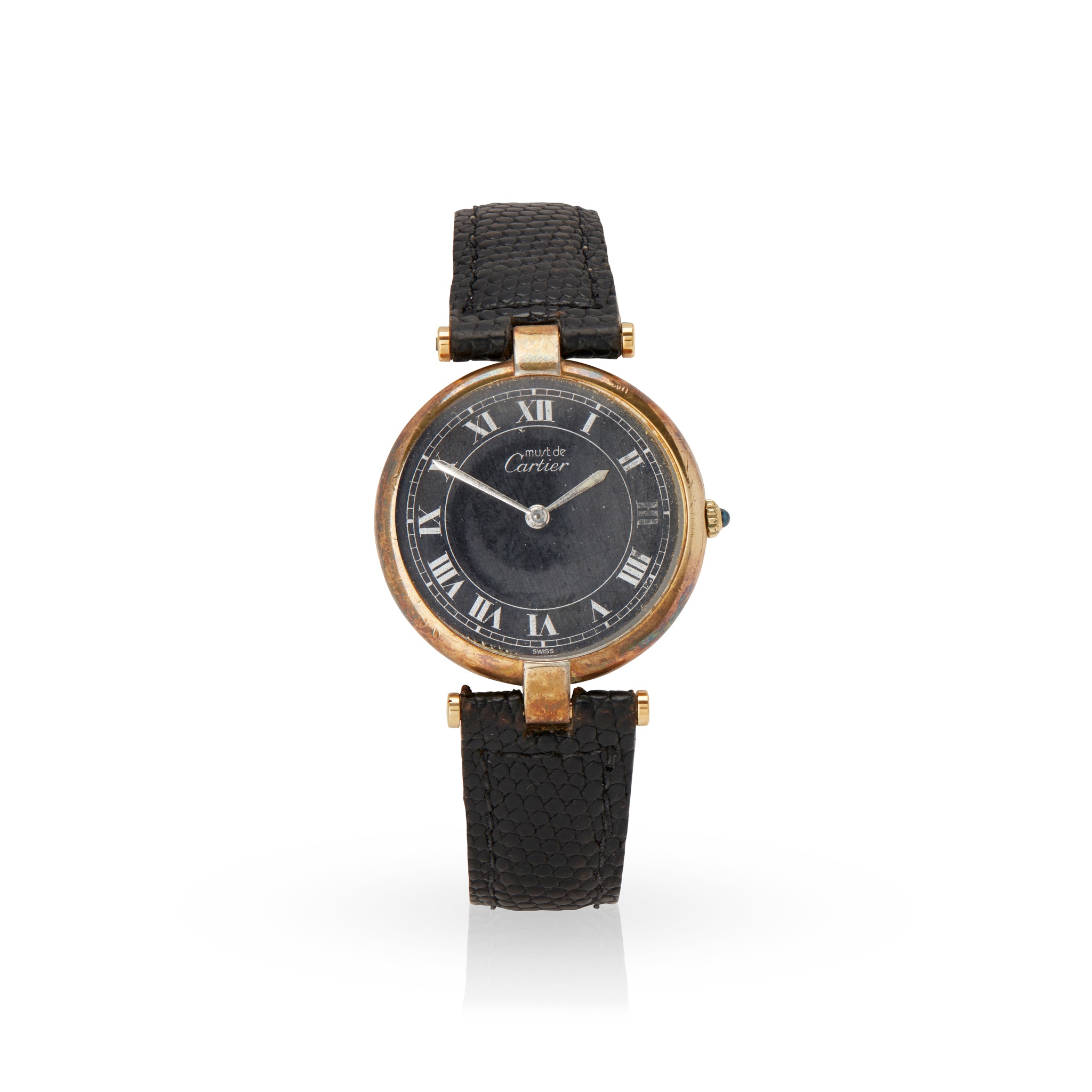 Vermeil Must model, silver-gilt case, round black dial with white Roman numerals, outer seconds track, silvered hands, sapphire cabochon crown, on a signed black strap, possibly lizard, generic clasp