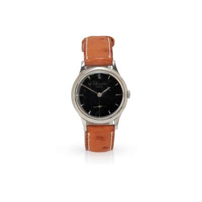automatic, Black circular dial with baton indicators, polished dagger hands, subsidiary seconds dial at 6 o'clock, plain hands and subsidiary seconds hand, Ostrich leather strap