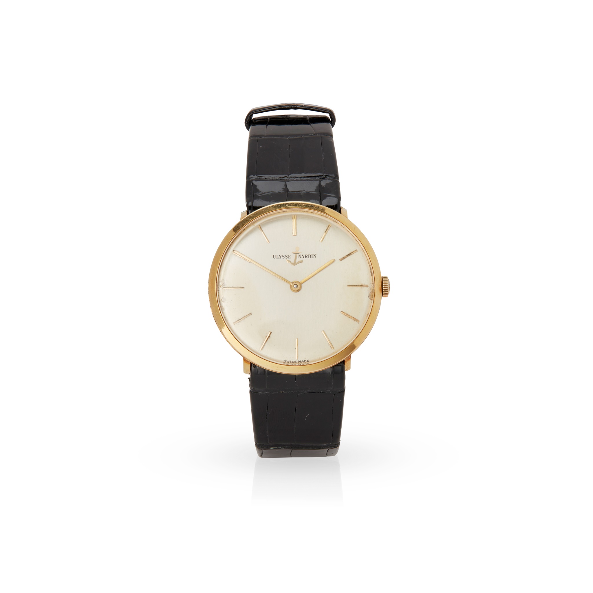 Case marked 18K, signed Ulysse Nardin N10AA manual wind movement numbered 5804225, round silver-coloured dial with applied gold baton hour markers, gold pencil hands, with model number to the caseback, on a crocodile skin strap, no box and papers