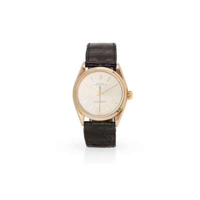 Oyster Perpetual model 1002, c.1973 from serial number between lugs, round silver-coloured dial with applied gold 12, 3, 6 and 9 o'clock and arrowhead hour markers, gold pencil hands, centre seconds hand, screw-down crown with coronet, on a signed Rolex black strap, possibly alligator, with a Rolex buckle marked 750, no box and papers