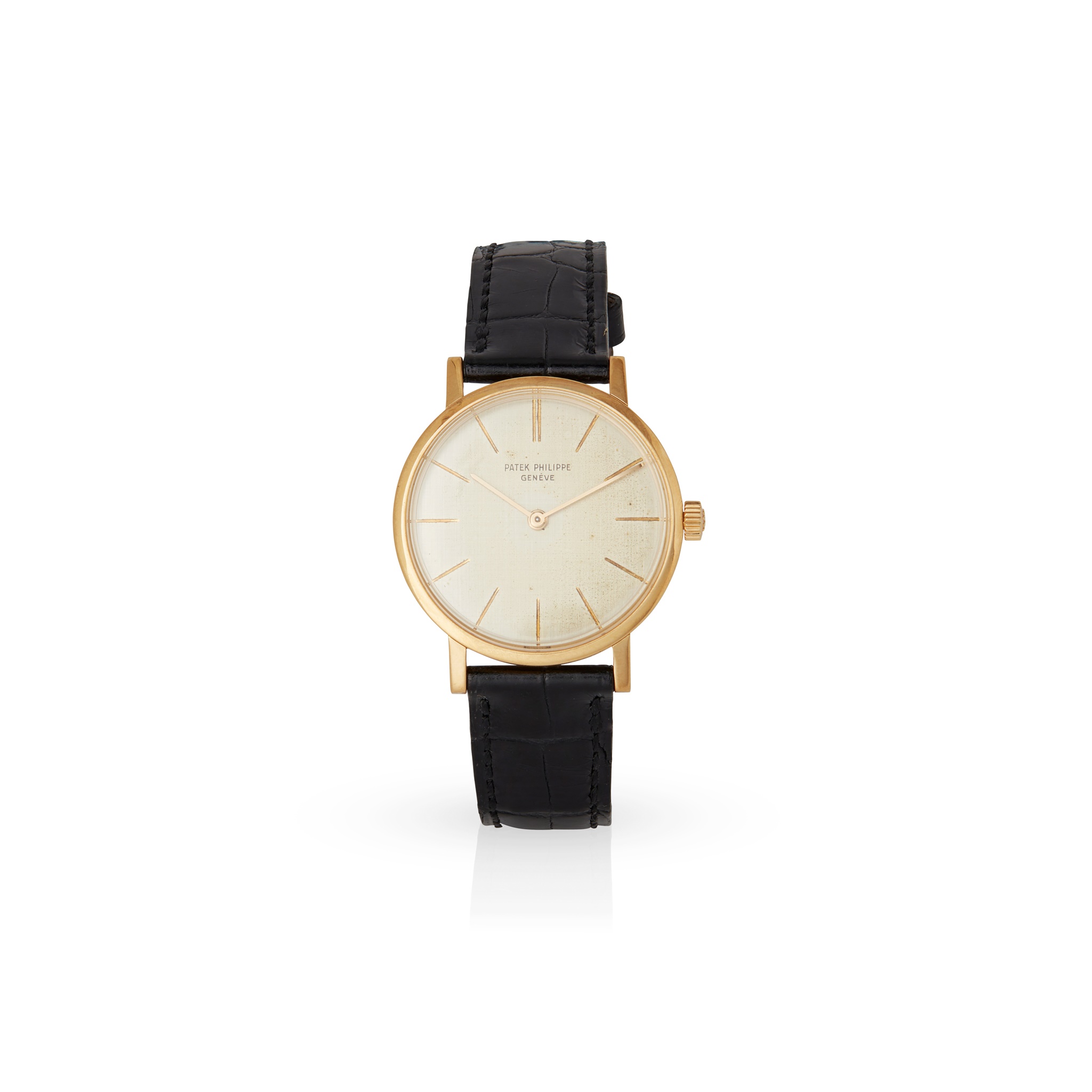 Calatrava model, round champagne basket weave dial with baton indicators, crocodile skin strap and gilt Omega buckle
