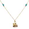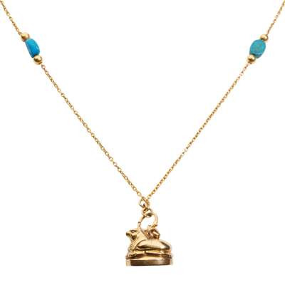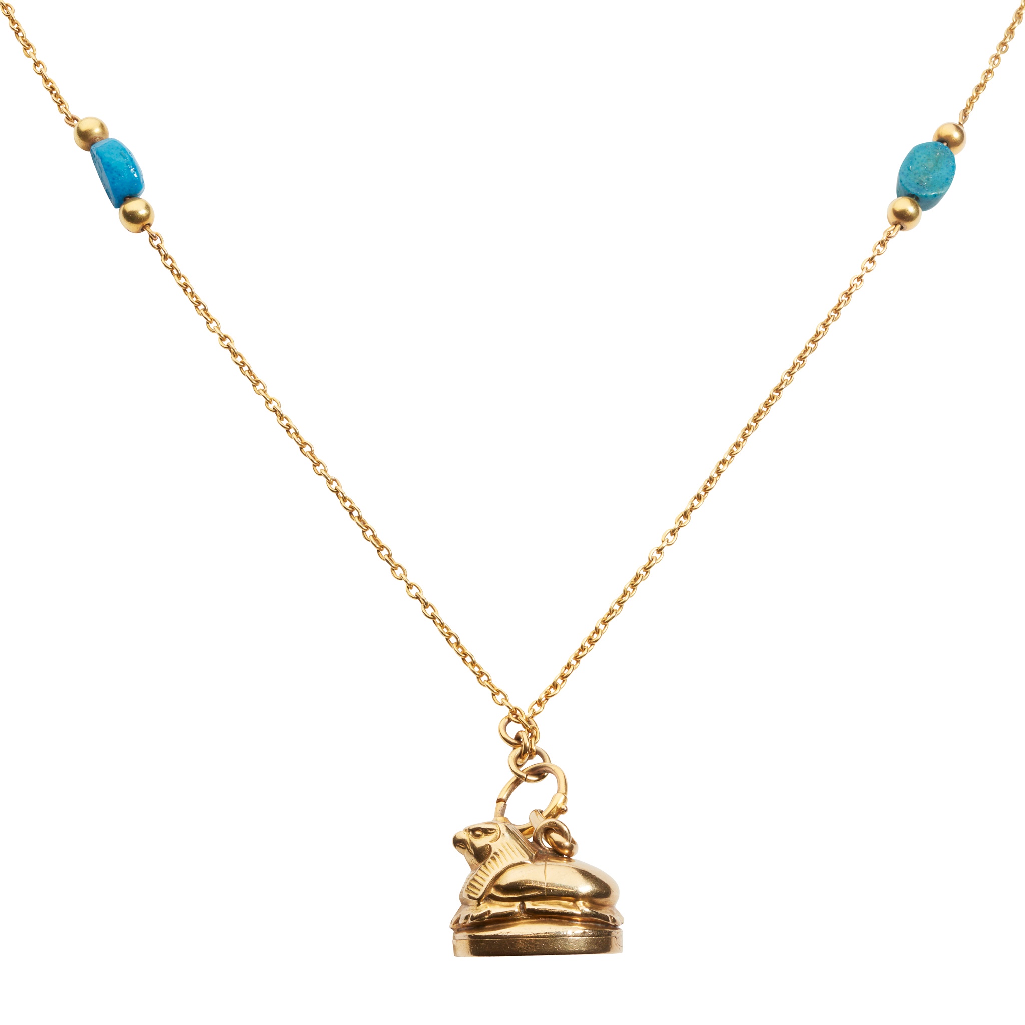 The locket modelled as Horus with engraved hieroglyphs, suspended from a belcher-link chain with beaded and blue hardstone detail, unmarked