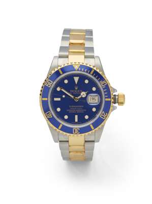 Oyster Perpetual Date Submariner model 16613, 2006 from papers, stainless steel case, automatic movement, round blue dial with applied gold-edge lume plots, date aperture at 3, lume-filled Mercedes hands, centre seconds hand with lume plot, 18ct gold bezel with blue insert and count-up scale, gold screw-down crown with coronet, caseback with sticker intact, on a bi-colour Oyster bracelet strap with signed Oysterlock clasp numbered OP2 3253, in box, with outer box and sleeve, with papers