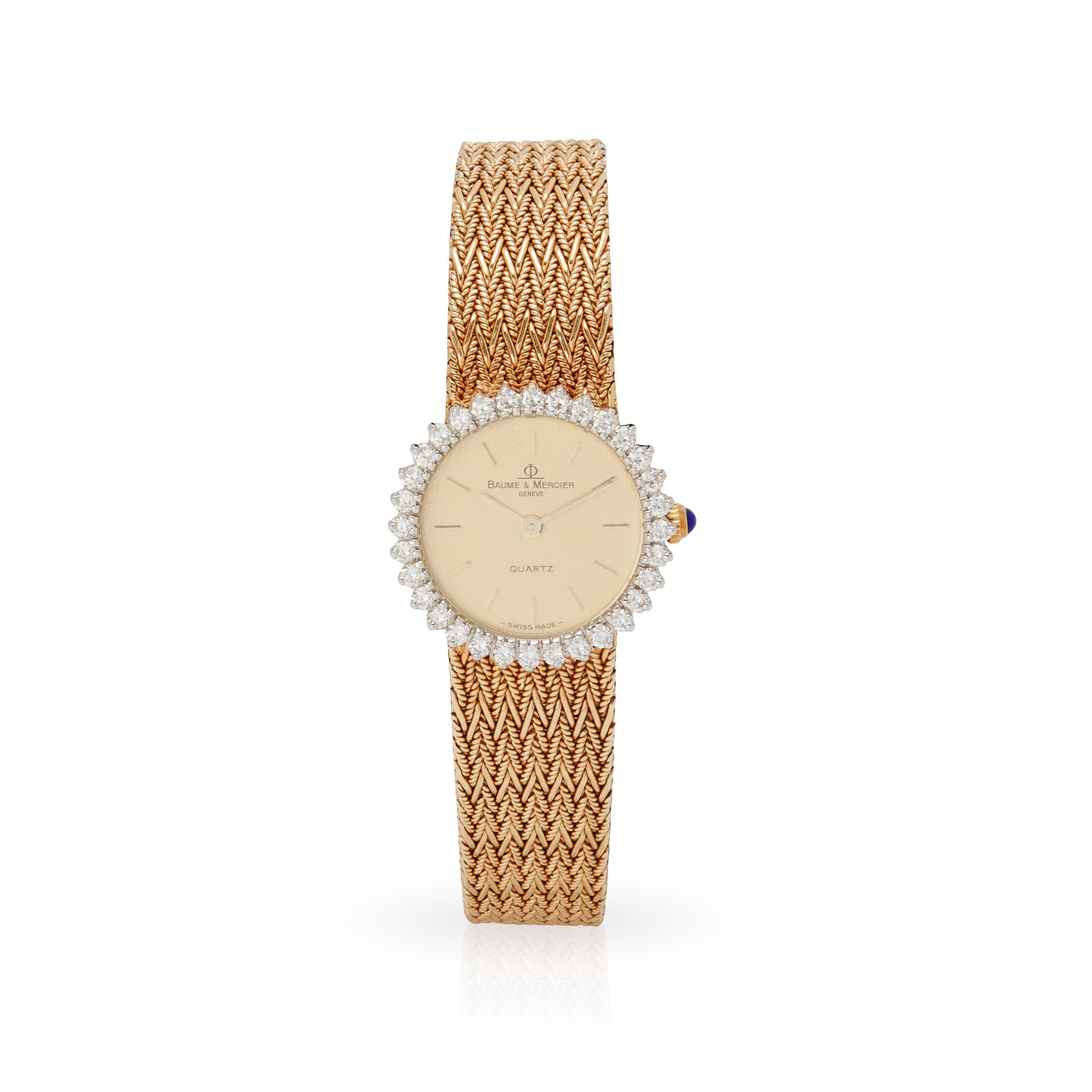 quartz movement, round champagne dial gilt baton indicators, round brilliant-cut diamond bezel, cabochon sapphire crown, integral 18ct gold rope-twist woven bracelet, monogrammed fold-over clasp