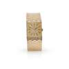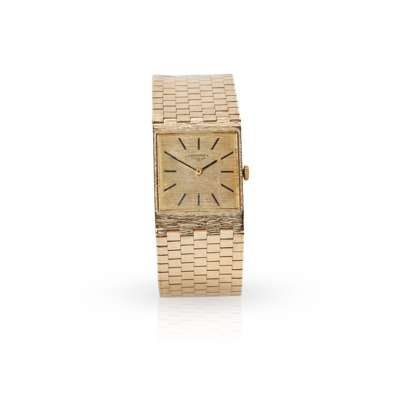 9ct gold case, unsigned manual wind movement, square textured gold dial with applied black baton hour markers, black pencil hands, plain crown, on a textured bracelet strap with foldover clasp with Longines logo