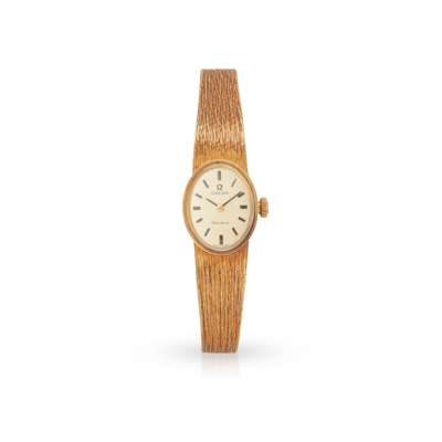 Small oval champagne dial with baton indicators, integral textured bracelet, fold-over clasp, stamped 750; in Omega box