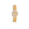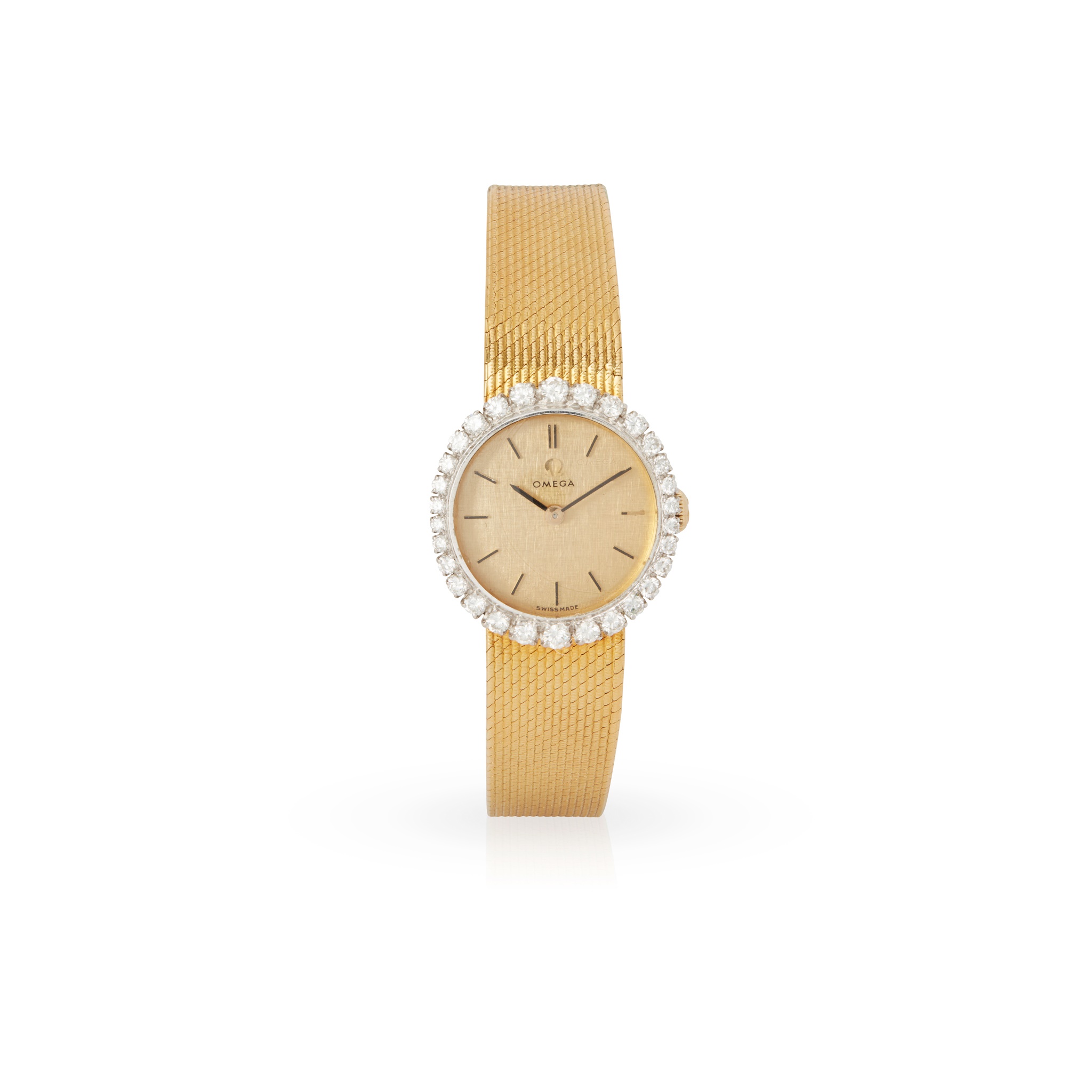 The circular champagne dial with baton indicators, black pencil hands, the bezel set with a row of round brilliant-cut diamonds, to an integral woven link bracelet and a fold-over clasp, modelled in 18ct gold