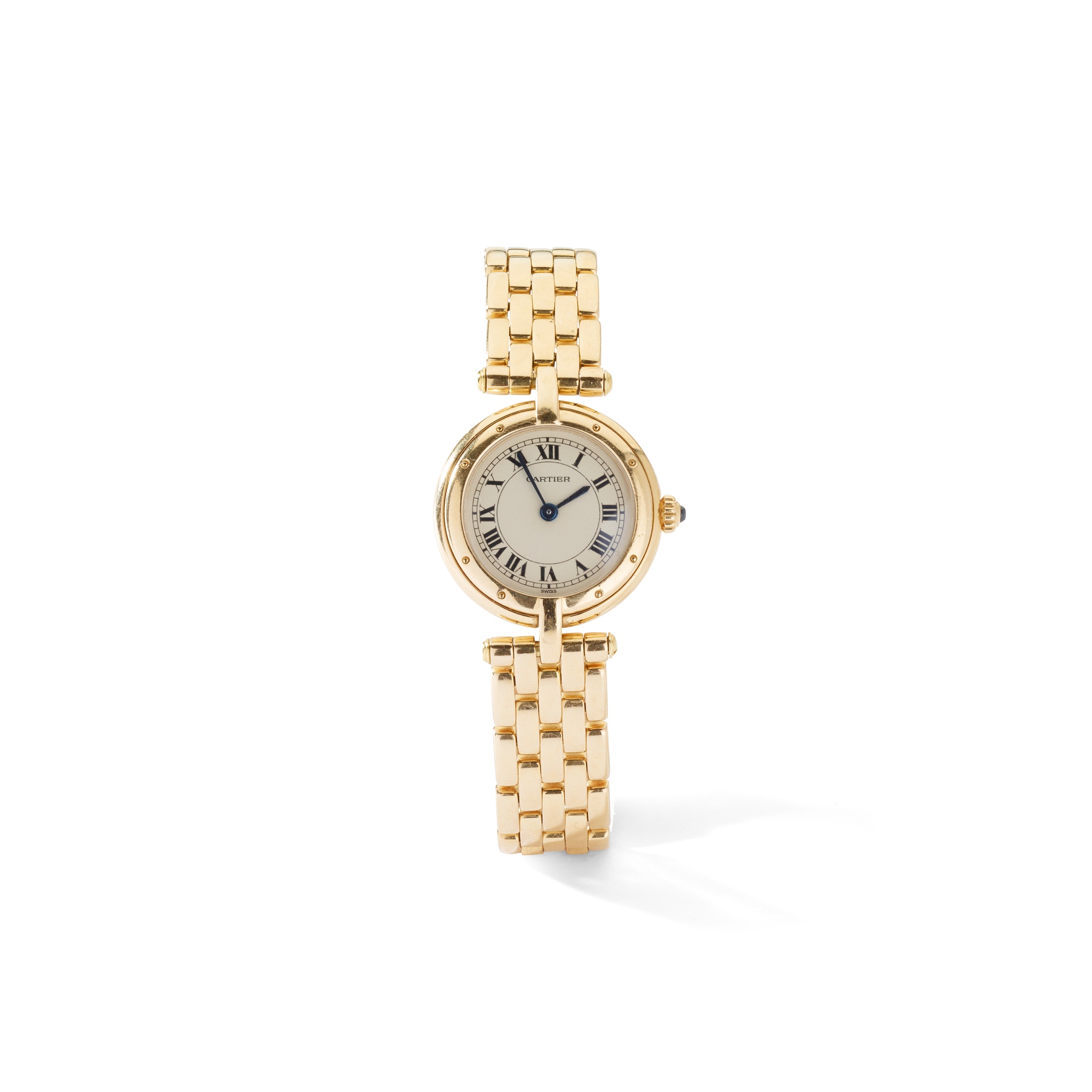 Panthère Ronde model, 18ct gold case, quartz movement, round buff dial with Roman numerals in black, railroad outer seconds track in black, blued steel sword hands, bezel with pinhead motifs, signed caseback with serial number, cabochon gem-set crown, on an integral 18ct gold bracelet strap to concealed clasp, with box, no papers