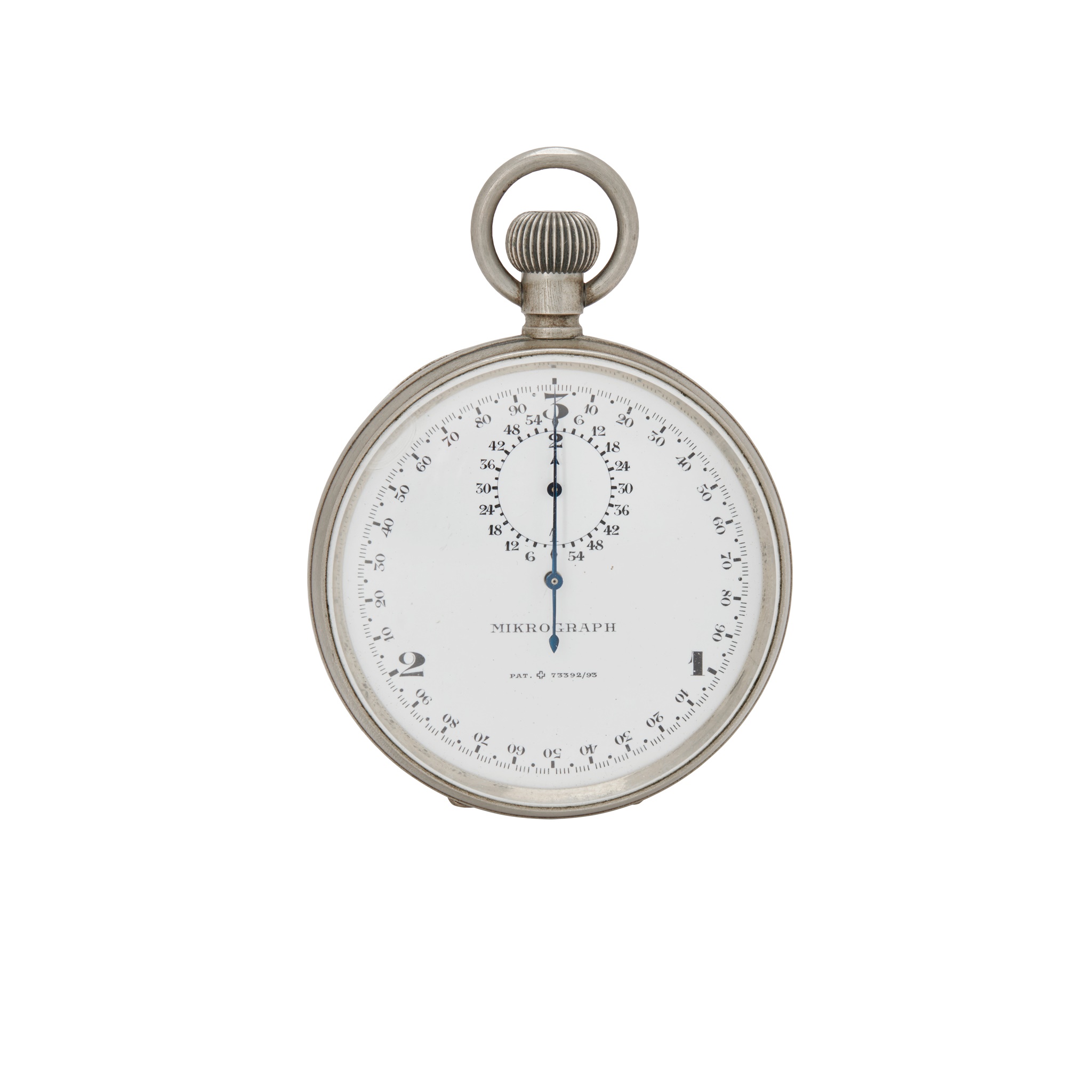 Mikrograph model, unsigned movement numbered 58519, round white enamel dial with Arabic numerals in black, outer 1/100th of a second scale, subsidiary 3 second revolution dial, blued steel hands, case interior and movement cover both numbered 62274