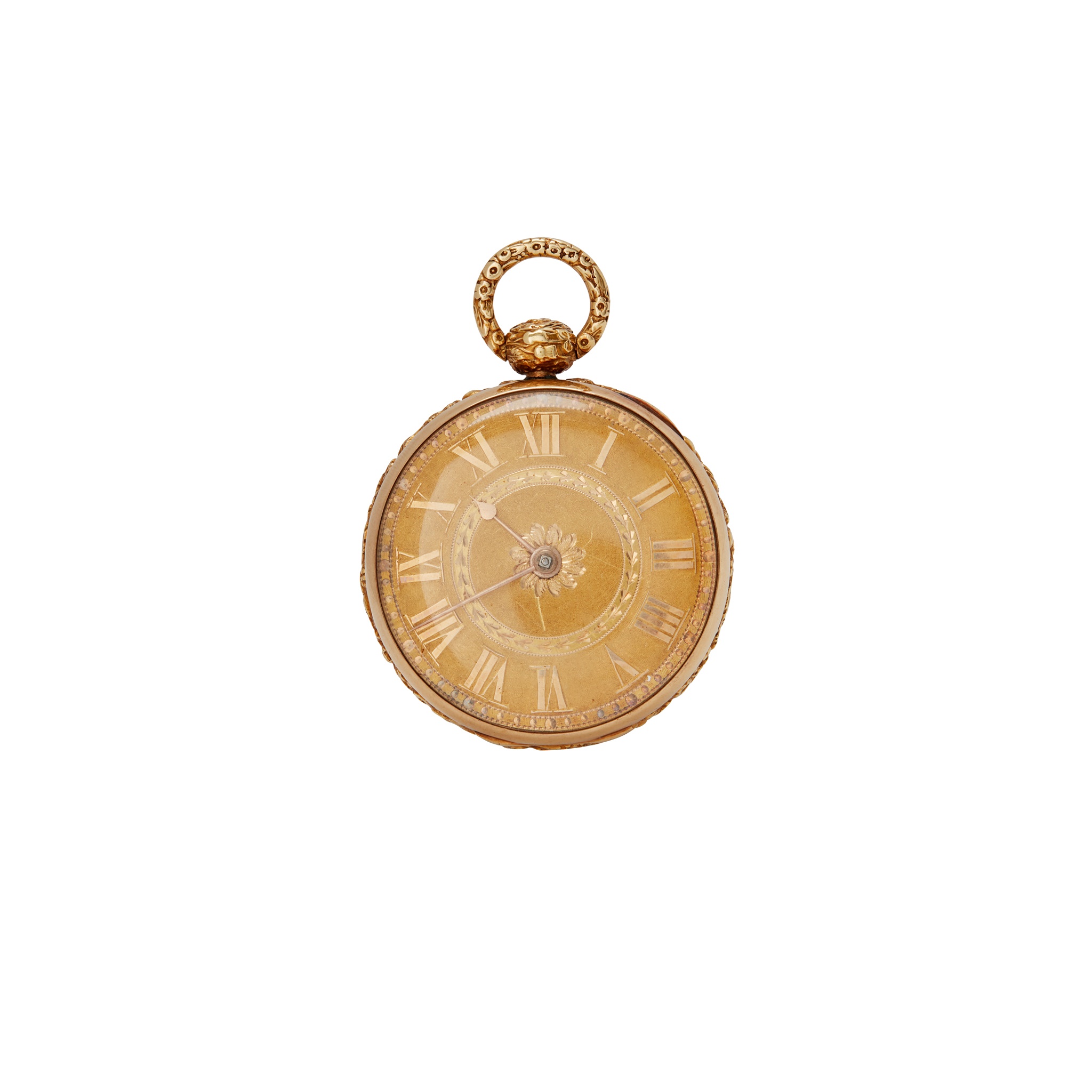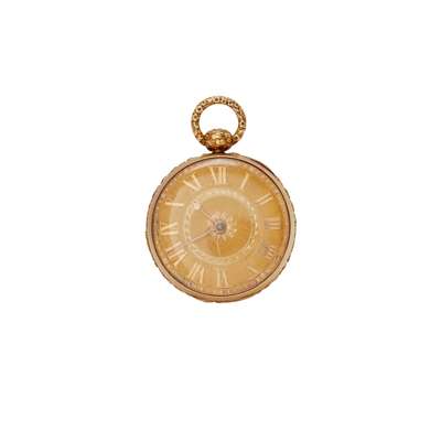 Round gold-coloured dial with Roman numerals in relief, gold leaf hands, case with ornate decoration in relief of a putto with a bow and arrow in a garden, partial Chester hallmarks, open-face key wind, movement signed M.F. Tobias Liverpool