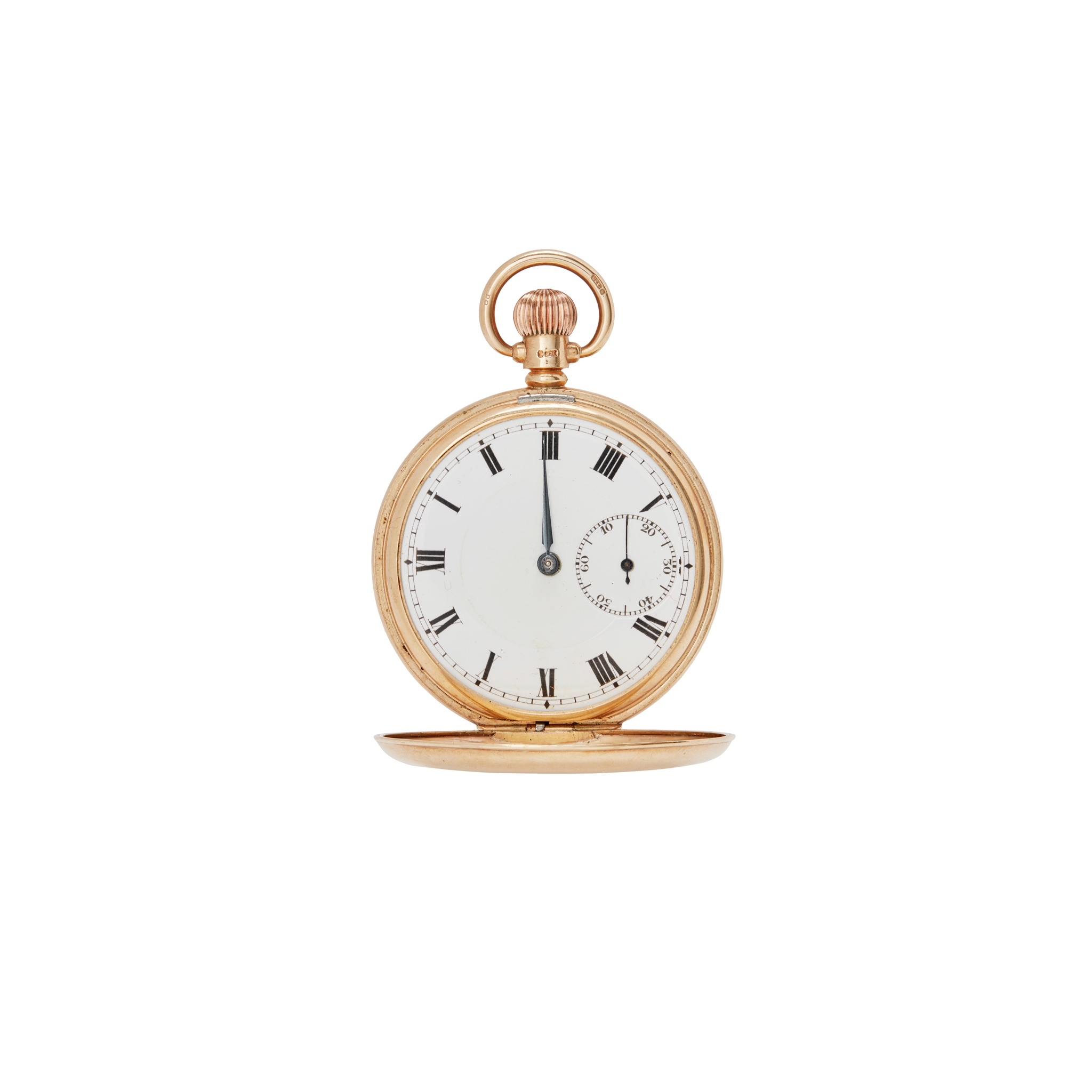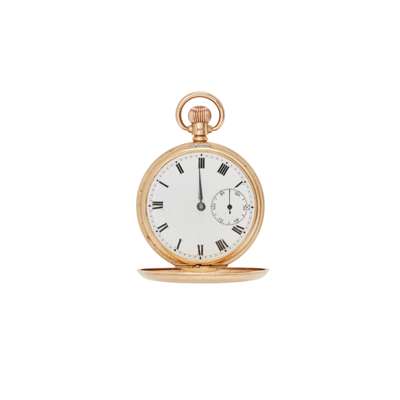 Full hunter, keyless wind, 9ct gold case with full Birmingham hallmarks for 1939, unsigned movement, round white enamel dial with Roman numerals in black, sunken small seconds at 6, railroad outer seconds track in black, blued steel hand (one missing), inscription dated 1940 to the movement cover