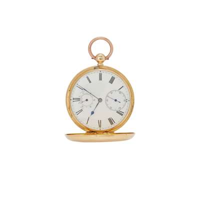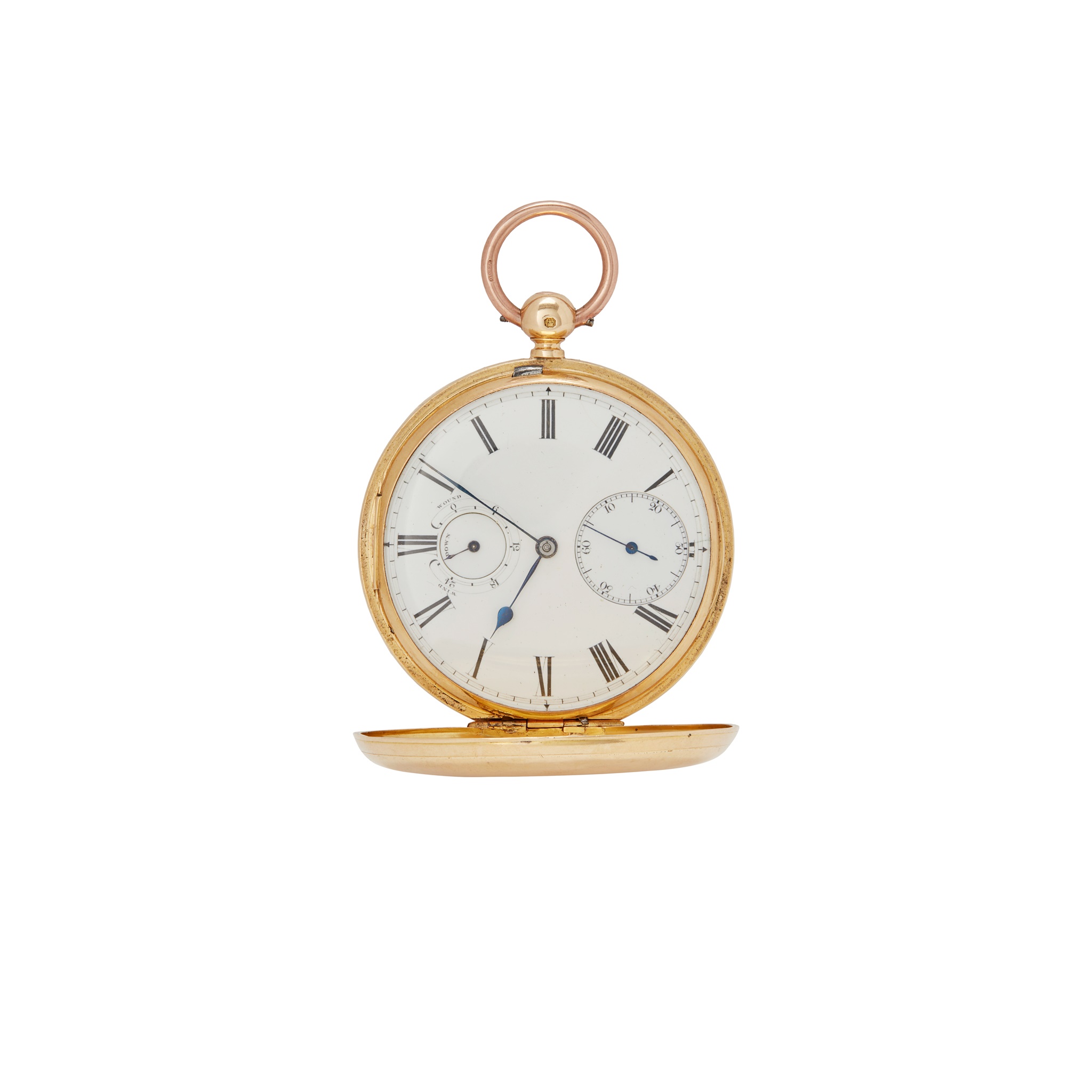 ¾ plate movement signed B. Lawley, London, inscribed ‘for William Jaffray, Glasgow,’ round white enamel dial with Roman numerals in black, sunken small seconds at 6, power reserve indicator at 12, railroad outer seconds track in black, blued steel leaf hands, with monogram to casefront, full London hallmarks for 1869,