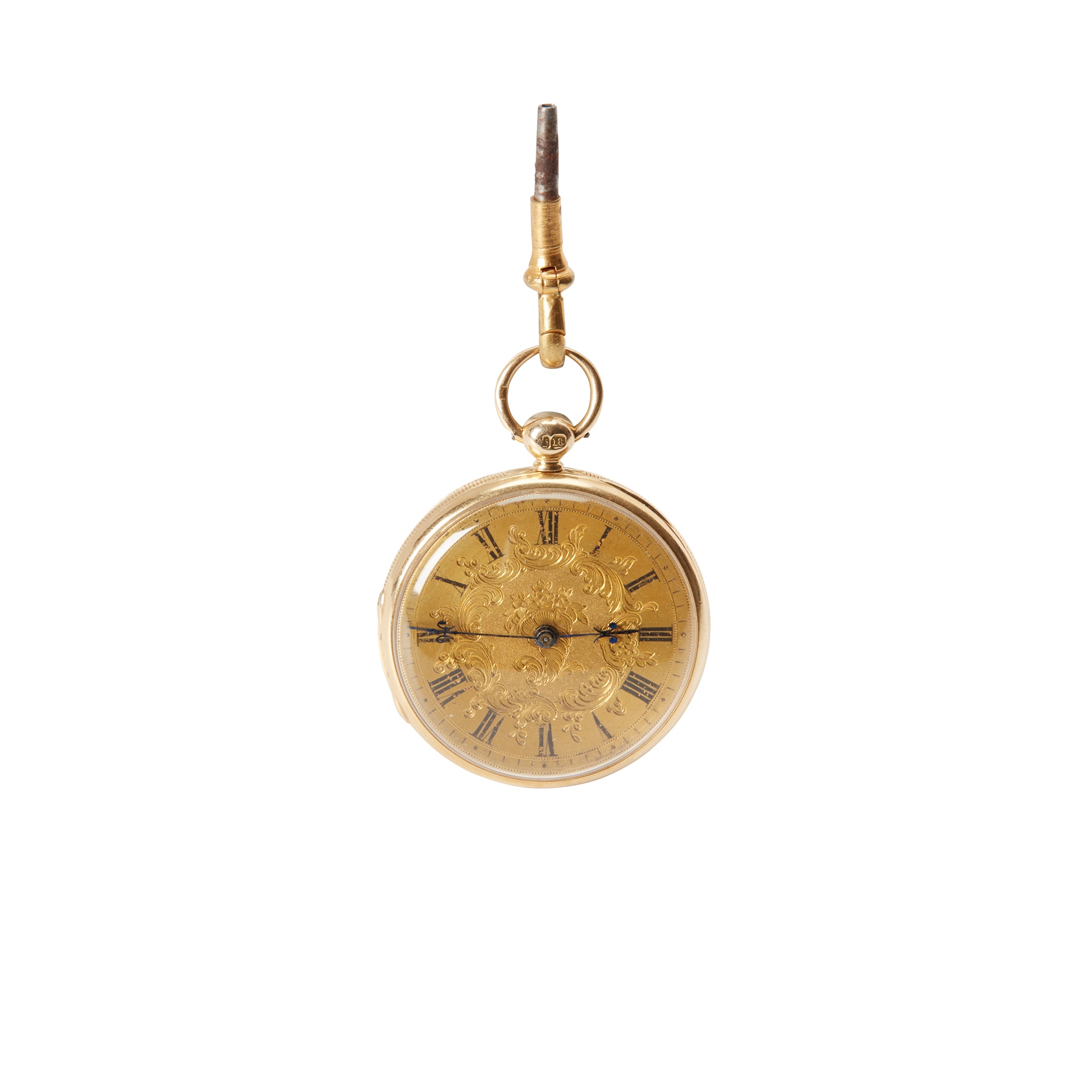 Gilt dial with Roman numerals, blued hands, case with overall engine turned decoration, plain lever movement