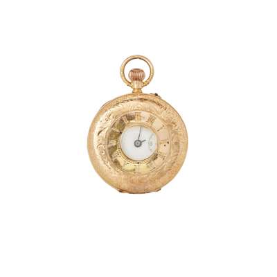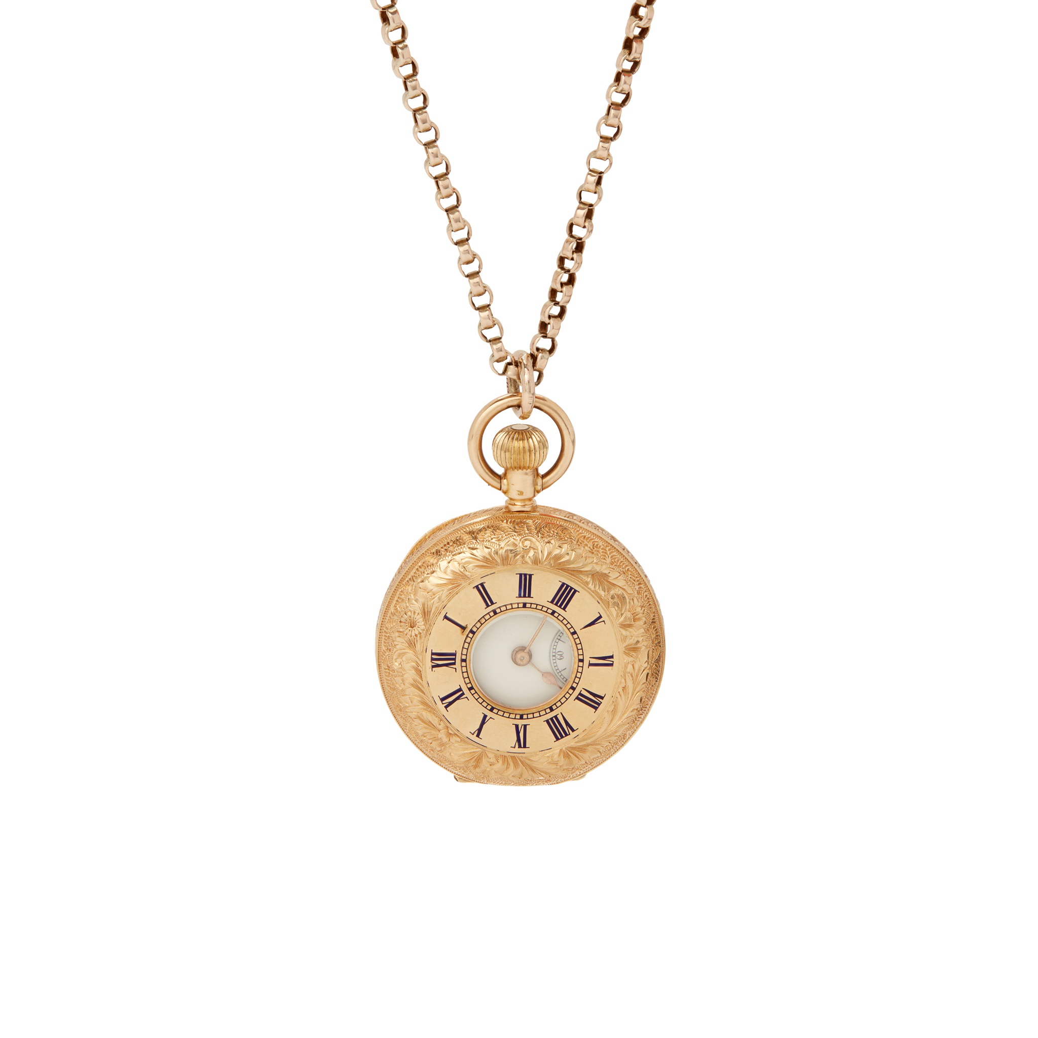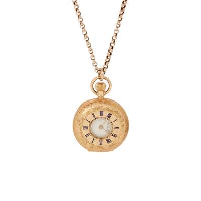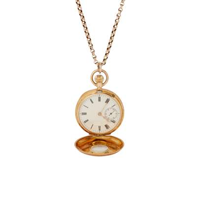 Half-hunter case stamped 18k, 3/4 plate movement with inscription to the place and numbered 1333605, round white enamel dial with Roman numerals in black, sunken small seconds hand 6, outer seconds track, gold leaf-style hands, the central case front with central aperture and enamelled Roman numerals in blue, inner railroad seconds track in blue, engraved detail to case throughout; suspended from an unmarked belcher-link chain