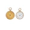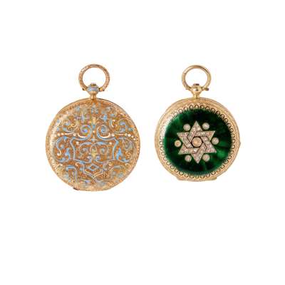 The first open-faced, key wind, gold-coloured dial with decorative engraving, Breguet-style hands, unsigned case and movement, caseback with blue enamelled decoration; the second open-faced, key wind, round white enamel dial with Roman numerals, Breguet-style hands, unmarked case and movement, caseback with rose-cut diamond star motif to a green enamel surround