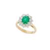 Claw-set with an oval-cut emerald in a border of round brilliant-cut diamonds, modelled in 18ct gold