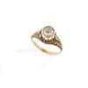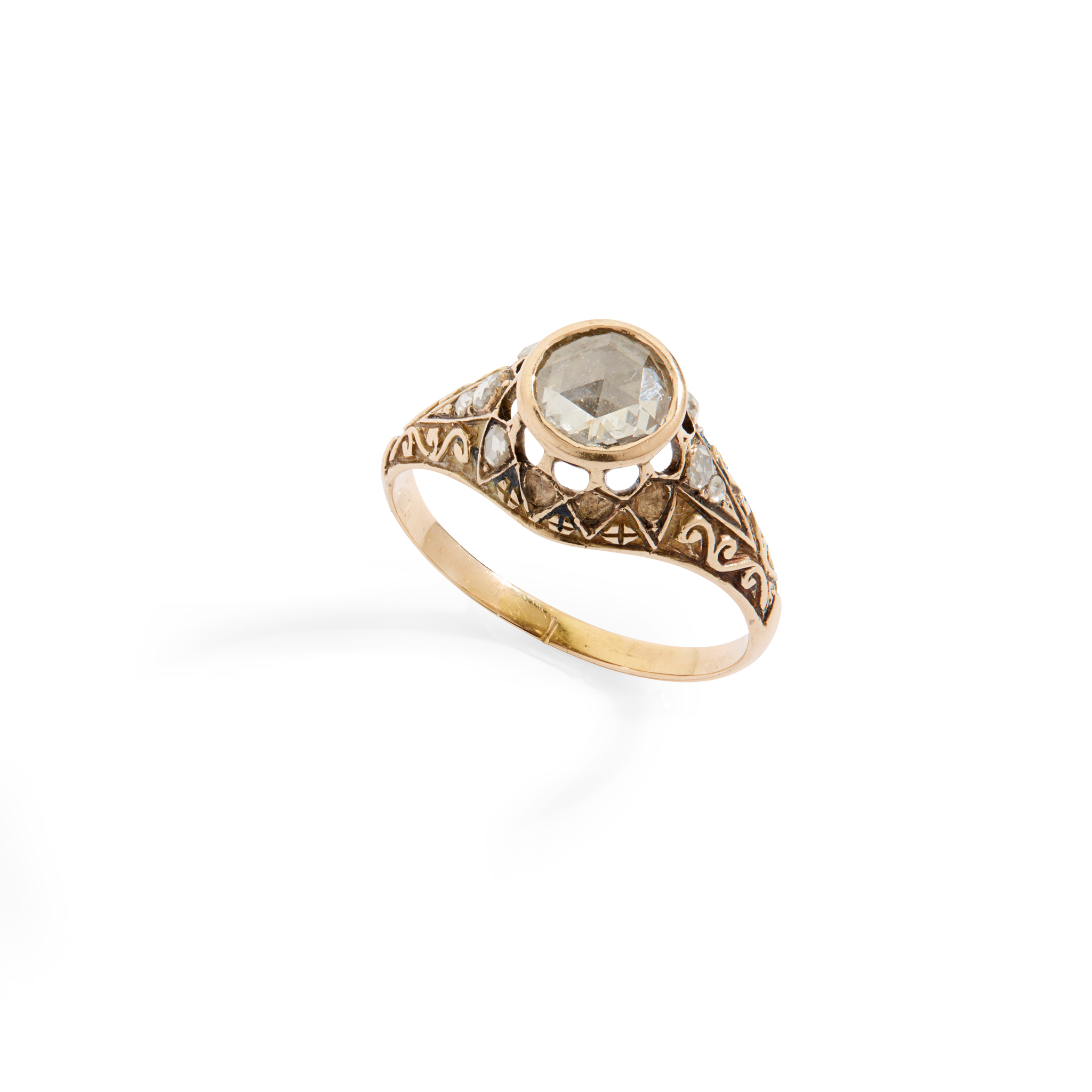 Collet-set with a rose-cut diamond in a raised setting set with smaller rose-cut diamonds, scrolling details to the shoulders, plain band, unmarked
