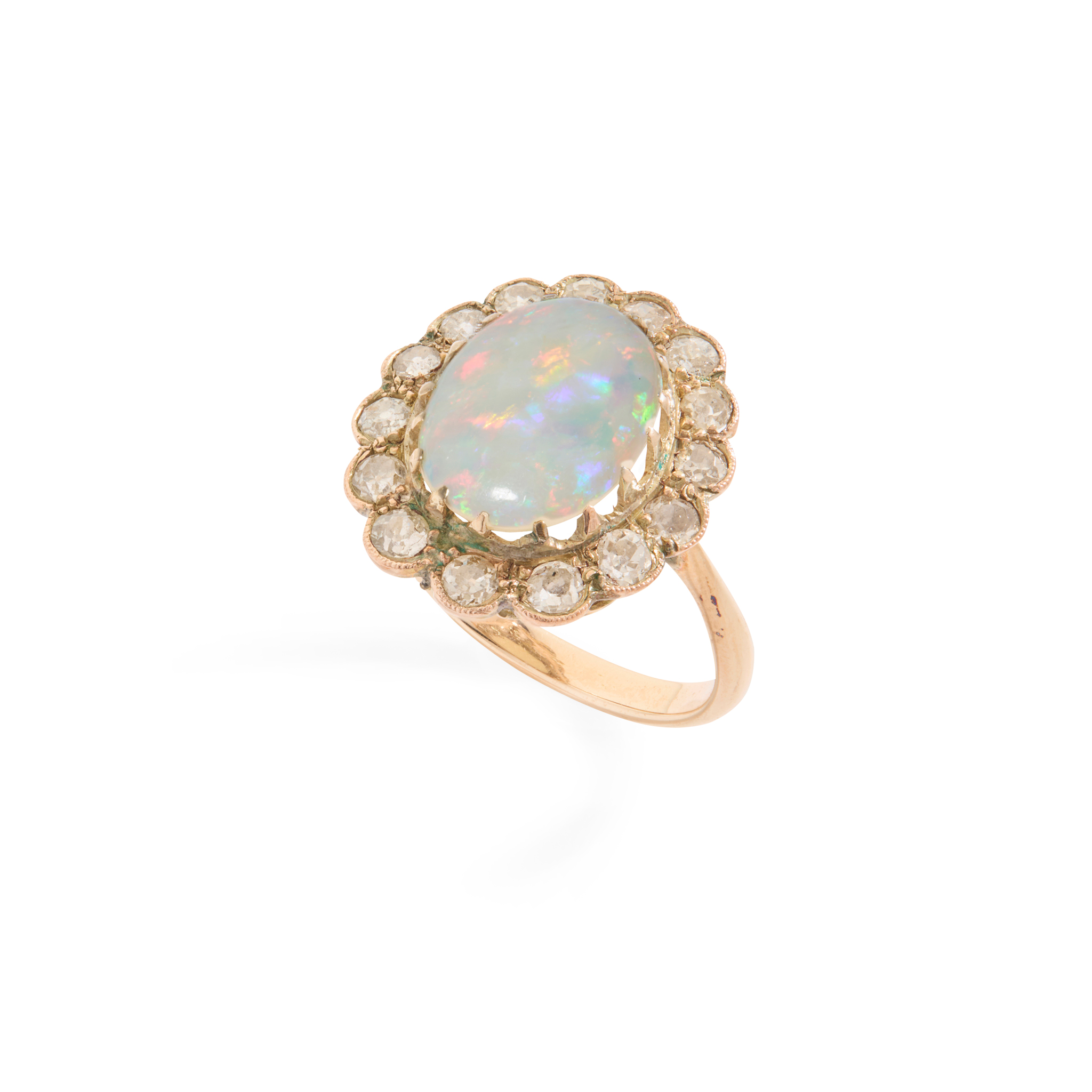 Claw-set with an oval cabochon opal in a border of fifteen old round-cut diamonds, plain band, unmarked