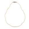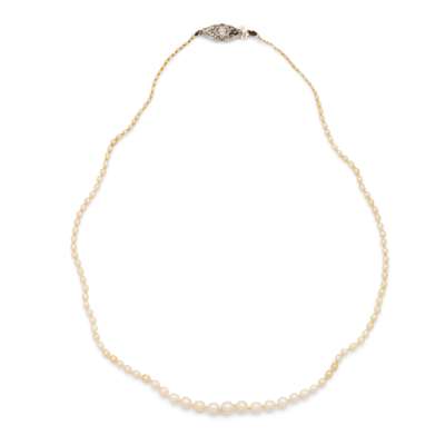 Composed of a single strand of (untested) graduated pearls, the lozenge shaped clasp collet set with a cushion-cut diamond, rose-cut diamond detail, indistinctly marked