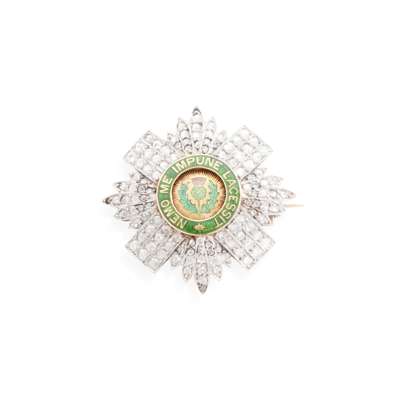 The thistle motif and motto in green and gold enamel, in a pavé-set surround of rose-cut diamonds, unmarked