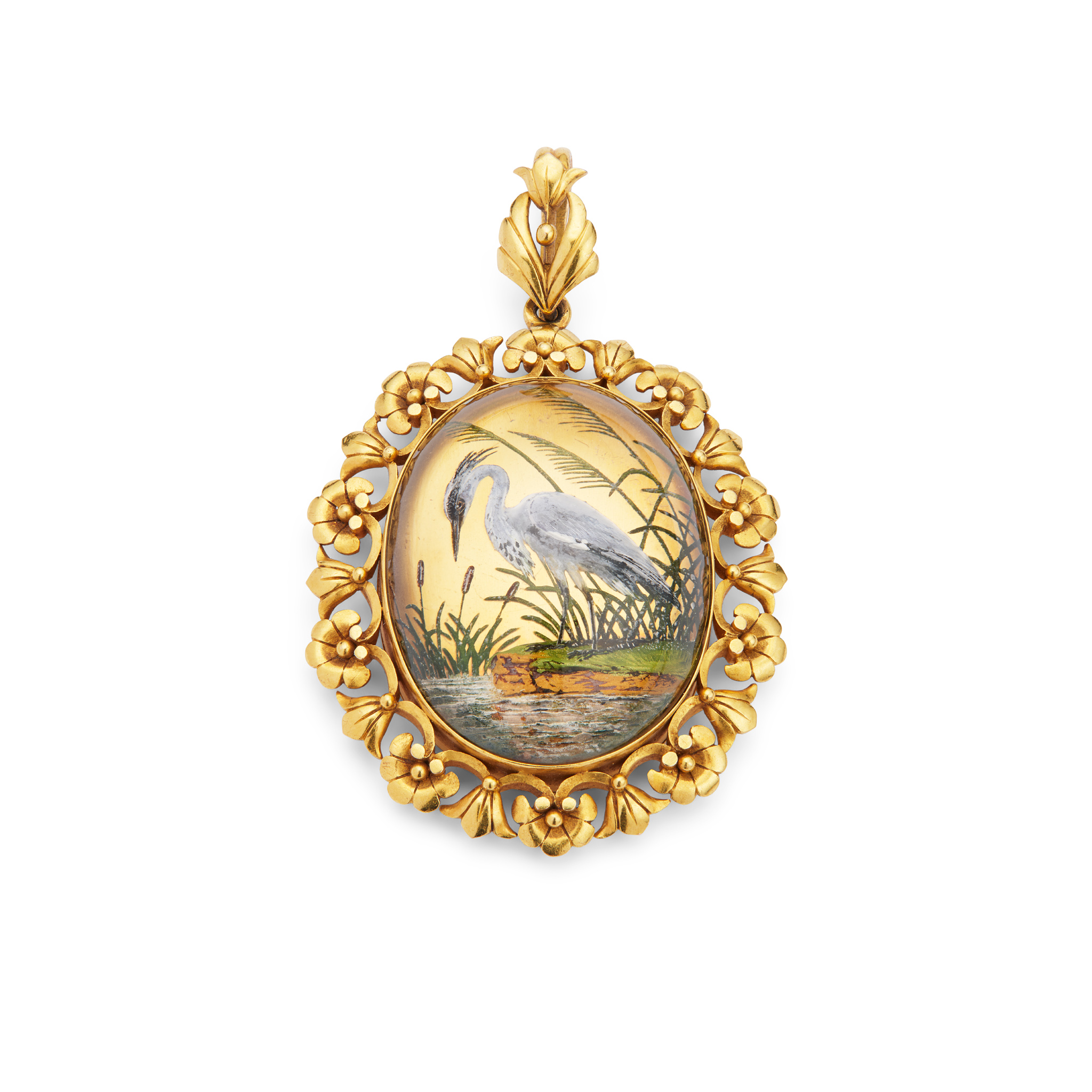 The oval Essex Crystal cabochon depicting a heron on a river bank, in a stylised foliate border with glazed panel to reverse, unmarked