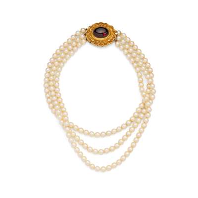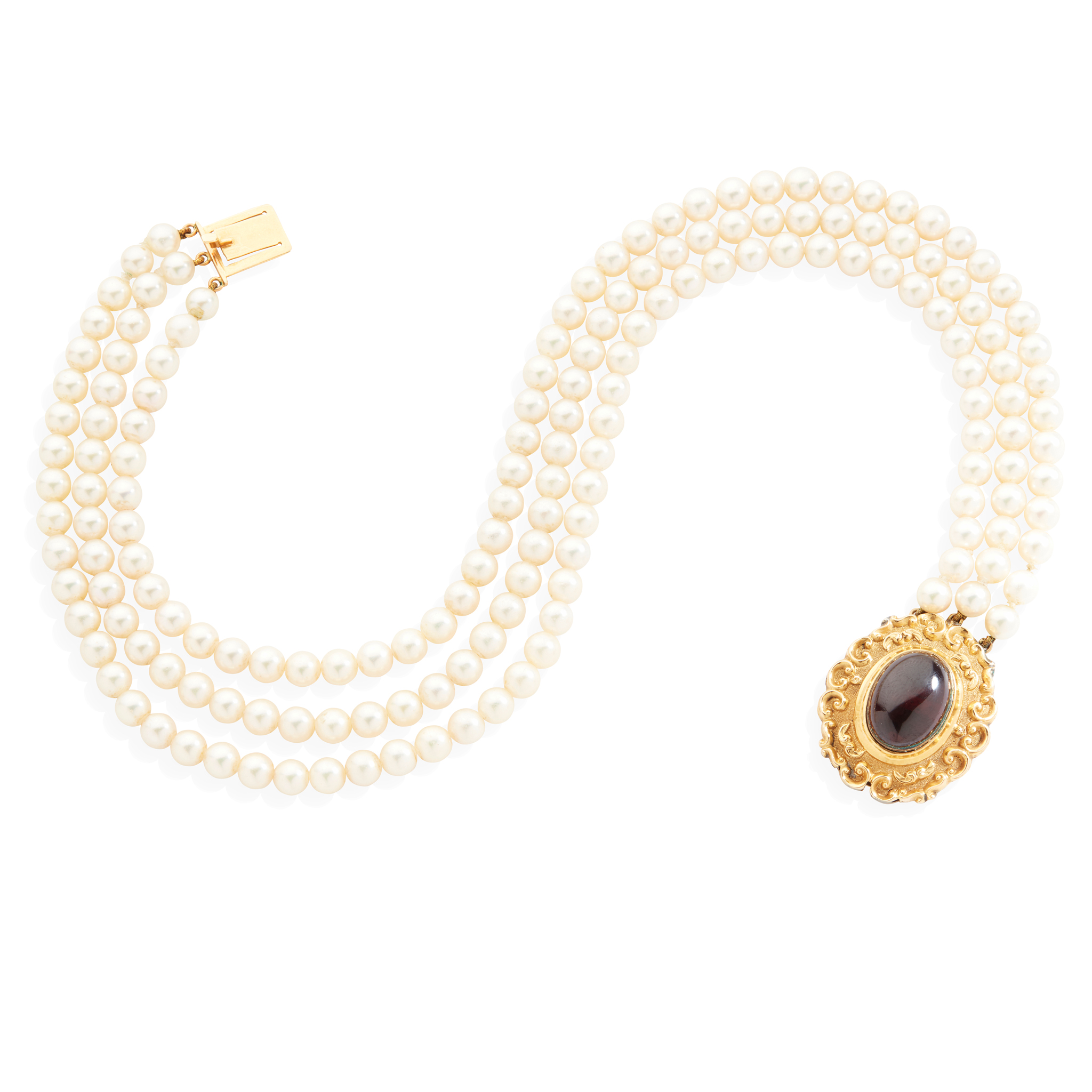 Composed of three strands of cultured pearls, to an oval clasp collet-set with a cabochon garnet, unmarked