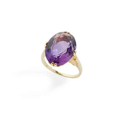 Claw-set with an oval-cut amethyst, scalloped detail to the setting, plain band, signed TIFFANY & CO, in original box