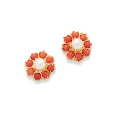 Each set with a cultured pearl in a border of cabochon corals, post fittings, unmarked