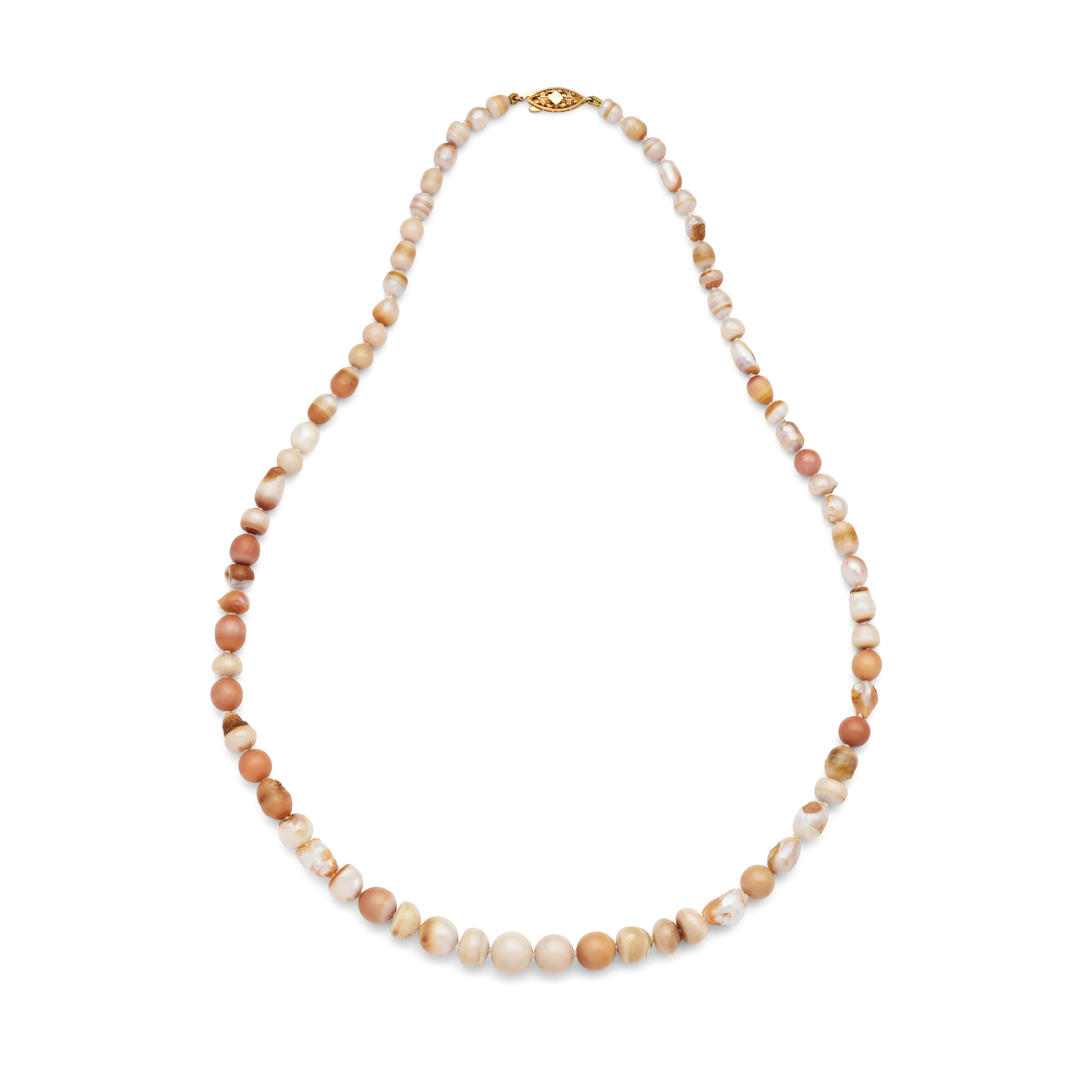 Composed of a single strand of graduated, slightly baroque Scottish freshwater pearls, to a 9ct gold lozenge-shape clasp, UK hallmark