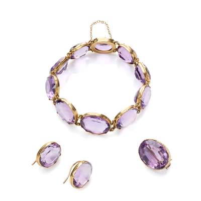 Including a bracelet, earrings and brooch, all collet-set with oval mixed-cut amethysts, earrings with hook fittings, unmarked (3)