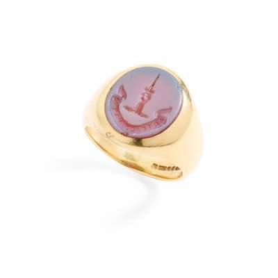 Collet-set with an agate matrix with engraved crest and motto, plain yellow gold mount, UK hallmarks