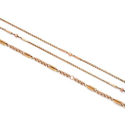 The first composed of scalloped square and rectangular-links, with engraved detail, stamped 9ct; the second composed of belcher links set at intervals with facetted ball and rectangular links, stamped 9c (2)