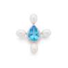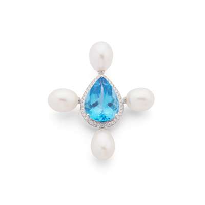 Claw-set with a pear-shaped blue topaz, in a border of small round brilliant-cut diamonds and four cultured pearls, stamped Au750