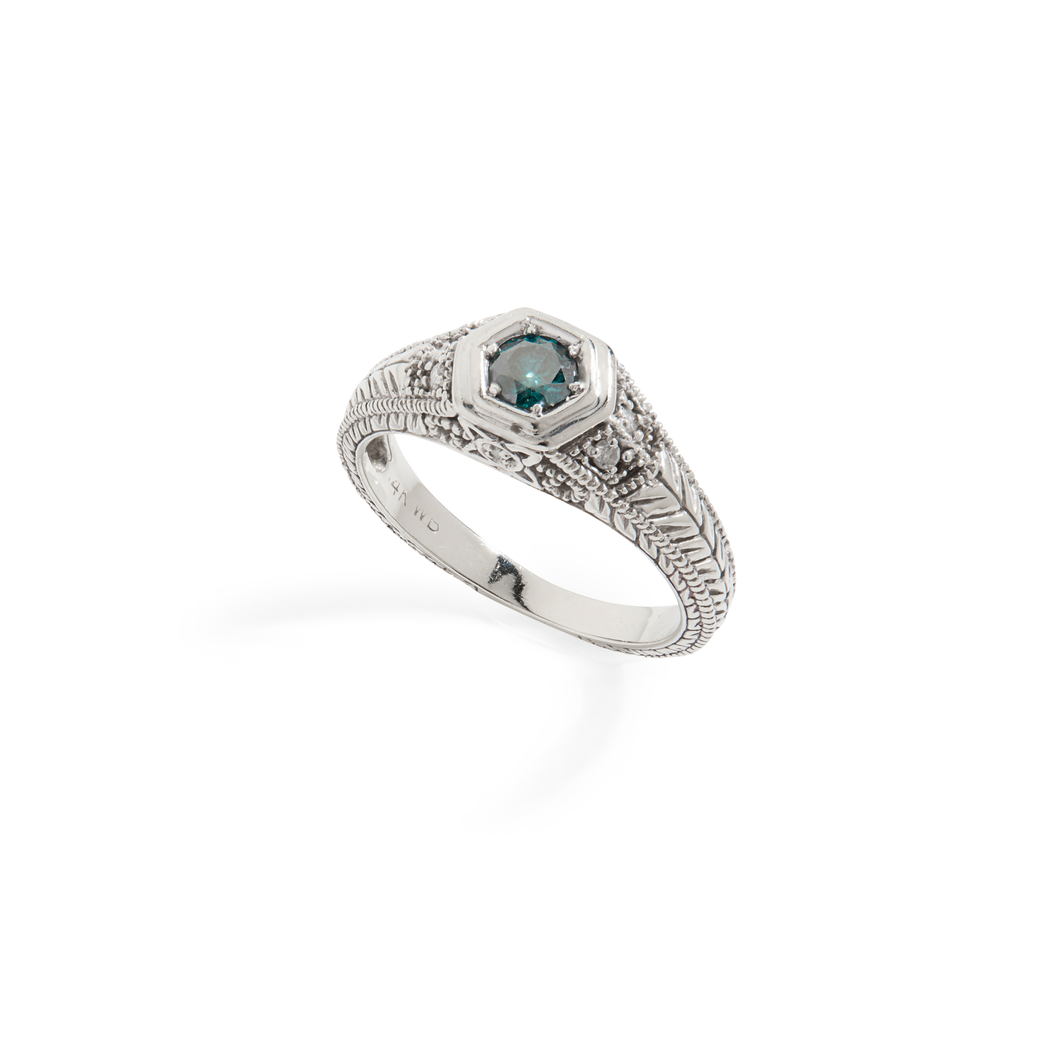 Set with a round brilliant-cut blue diamond, in a filigree style mount set with small round brilliant-cut colourless diamond detail, engraved detail to band, stamped 14k